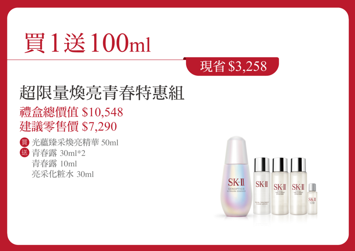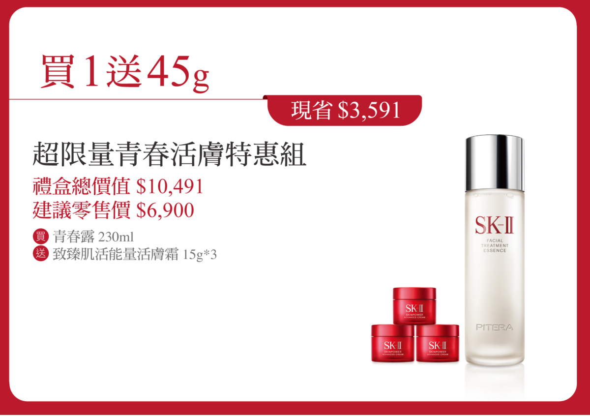 而且「超限量活膚青春特惠組」組合內還有青春露以及亮采化粧水,可以讓你完整擁有PITERA ™的極致呵護!