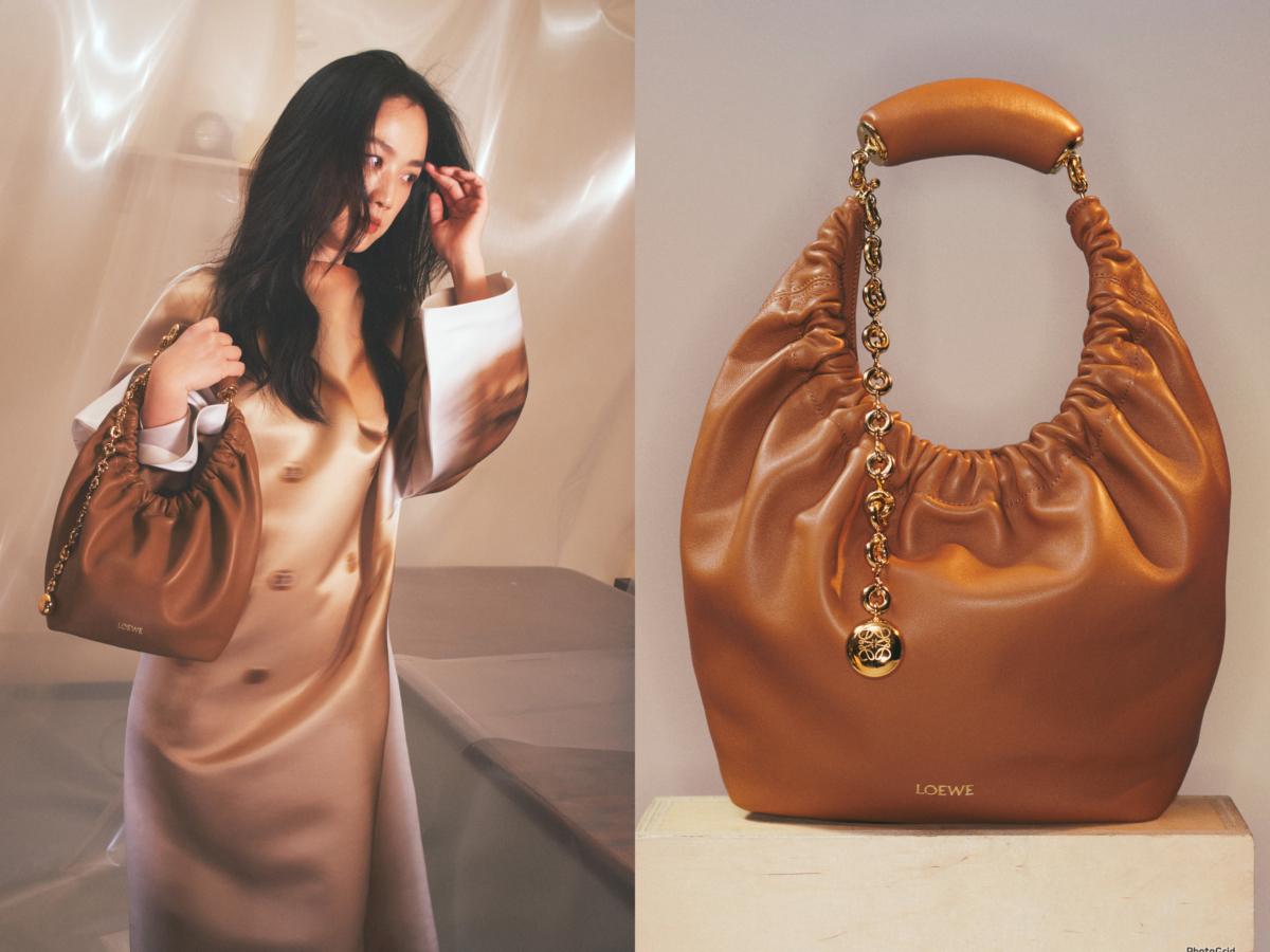 LOEWE Squeeze 包款在 2023 秋冬時裝秀首度亮相,以柔軟納帕小羊皮製成,圓潤的橢圓包型與抓皺設計,並搭配甜甜圈造型飾鍊帶,賦予獨特形態營造垂墜感,無內裡的設計讓包身更加輕巧。Squeeze 系列有多種色系可選擇,編輯認為其中焦糖棕、巧克力色最為經典,由湯唯呈現的嶄新視覺也充滿了秋冬濃厚意味,獨特造型中點綴著精緻優雅!