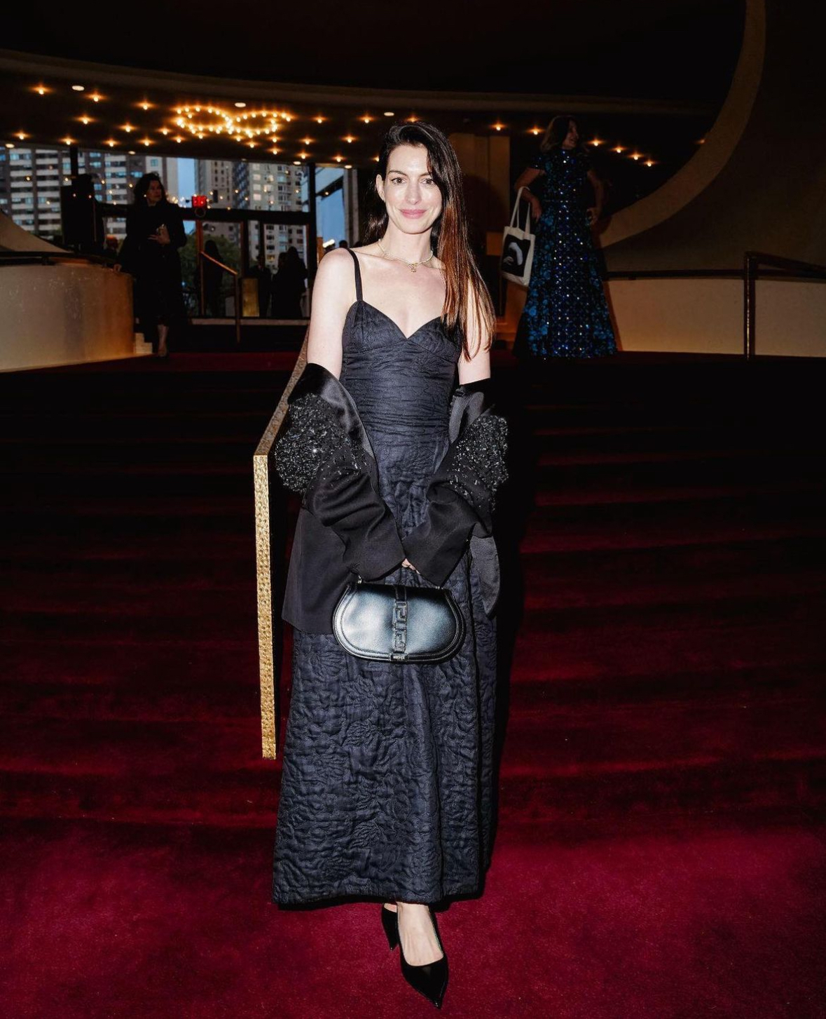 安海瑟薇(Anne Hathaway)出席大都會歌劇院《越過死亡線(Dead Man Walking)》揭幕晚會時,身穿Versace 1988春夏系列經典黑色絎縫及地晚禮服,兩側飾有亞麻襯墊以喇叭型剪裁往下延伸,大旁分長卷髮搭配自然妝容,有種個性又典雅氣質,手拿Versace 2023 年秋冬系列推出的Greca Goddess Top Handle 手提包,採平滑小牛皮製成,結合精湛的義大利皮革工藝與立體設計,霧面質感拿起來低調又時髦!