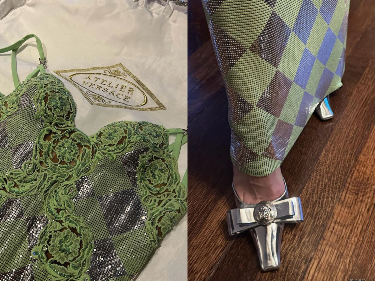 安海瑟薇(Anne Hathaway)身上這件Atelier Versace 淺綠色棋盤格紋晚禮服相信大家都不陌生,正是剛結束的Versace 2024春夏時裝周訂製款,由傳奇超模Claudia Schiffer首次現身在伸展台上,以玫瑰蕾絲花瓣點綴在胸前的低胸V領設計,柔和的淡淡薄荷綠搭配金屬紗線交織而成的面料,向來是Versace拿手的金屬紗洋裝,這套也成為了秀上的晚裝焦點!安海瑟薇盤起高顱頂髮型,深邃五官與秋系妝容,穿出了不一樣的更加撫媚、性感,還帶點古典氣息,搭配同樣由她代言的寶格麗Serpenti 珠寶系列,纏繞在腕間的手鐲設計,更為整體造型點綴亮點!