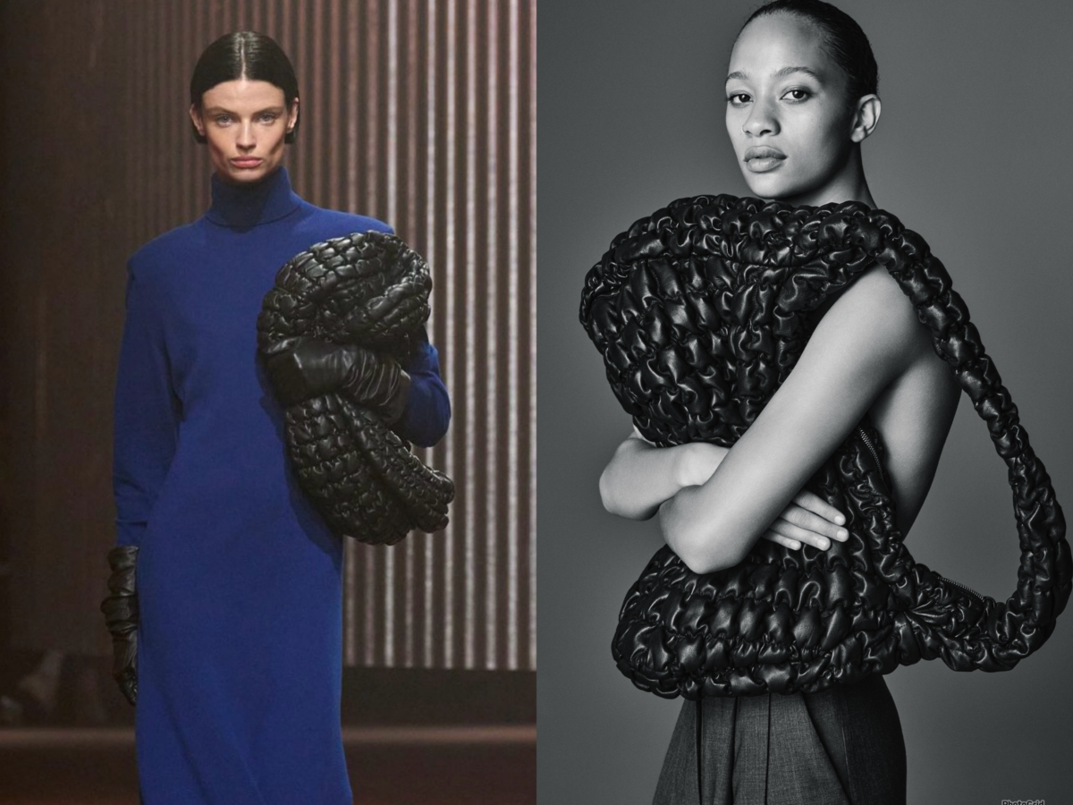 今年夏天人人必備、從國中女學生一直到BlackPink Jennie都超愛的明星單品「雲朵包」,在秋冬換上了全新質感,從原本的輕盈尼龍面料,換上俐落的皮革材質,採用像是奶油般柔軟的皮革材質,保存雲朵包最具指標性的蓬鬆軟綿、如枕頭般的療癒手感,內部同樣設拉鍊內袋,包括三種尺寸秀場上的超大尺寸、日常實用的尺寸和迷你小尺寸。