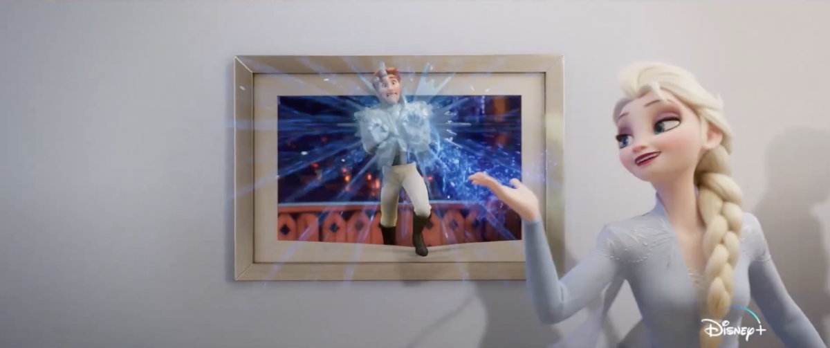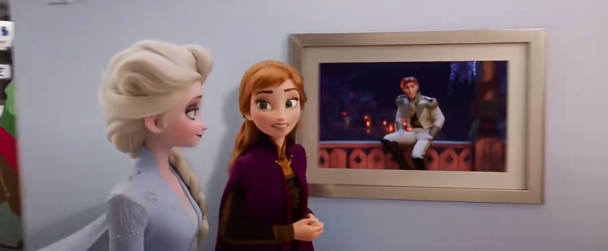 兩人在轉角走廊中準備前往門口集合拍照,安娜因擔心會與前未婚夫相遇,小心翼翼的詢問姐姐艾莎:「妳覺得所有的反派都會來嗎?」,沒想到兩人剛好就經過漢斯所在的畫框,艾莎在妹妹安娜沒發現的情況下,立刻施展魔法把漢斯冰凍,阻止他從裡面出來,還一邊慢悠悠的回答安娜:「有些不會。」
