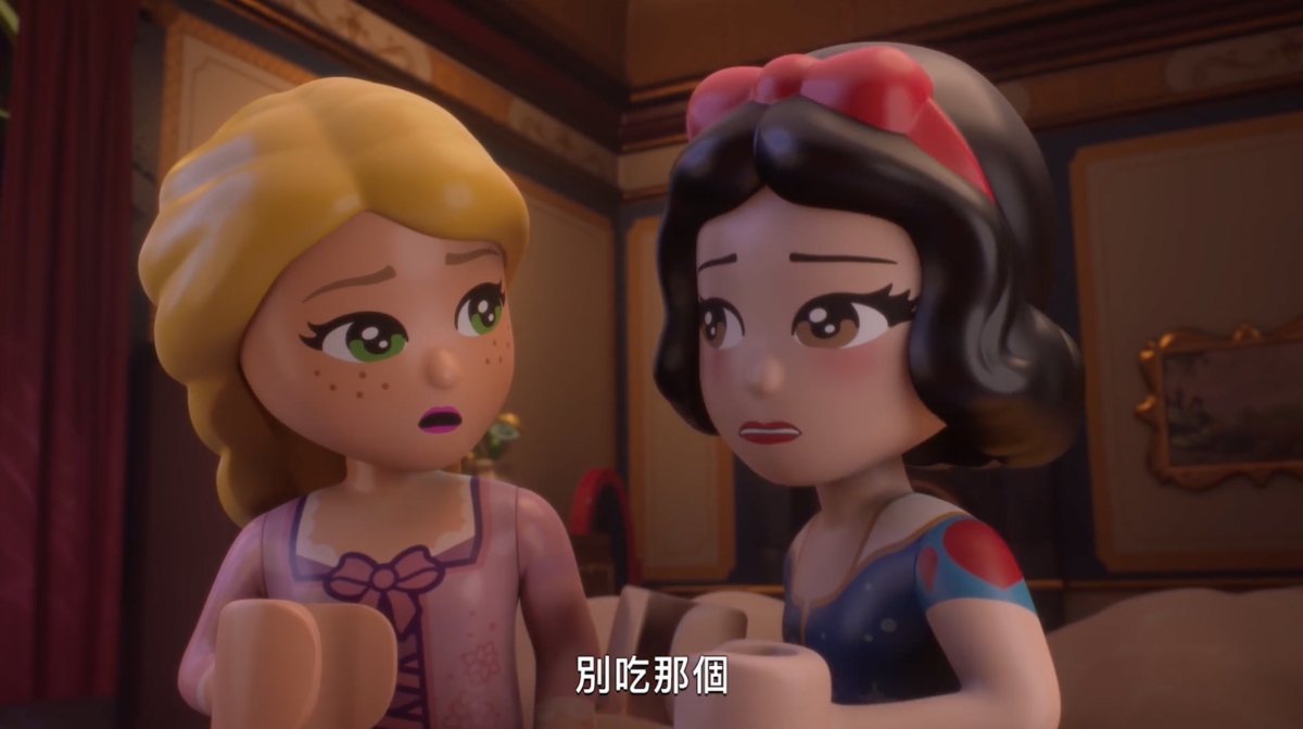 在《樂高迪士尼公主:城堡歷險》的預告片中,其中一幕樂佩看到水果籃,拿起一顆蘋果就要吃下去,這時白雪公主突然衝過去叫她不要吃,樂佩一臉問號的看著白雪公主的樣子實在太好笑,只能說,白雪公主對蘋果的陰影真的有夠深XD