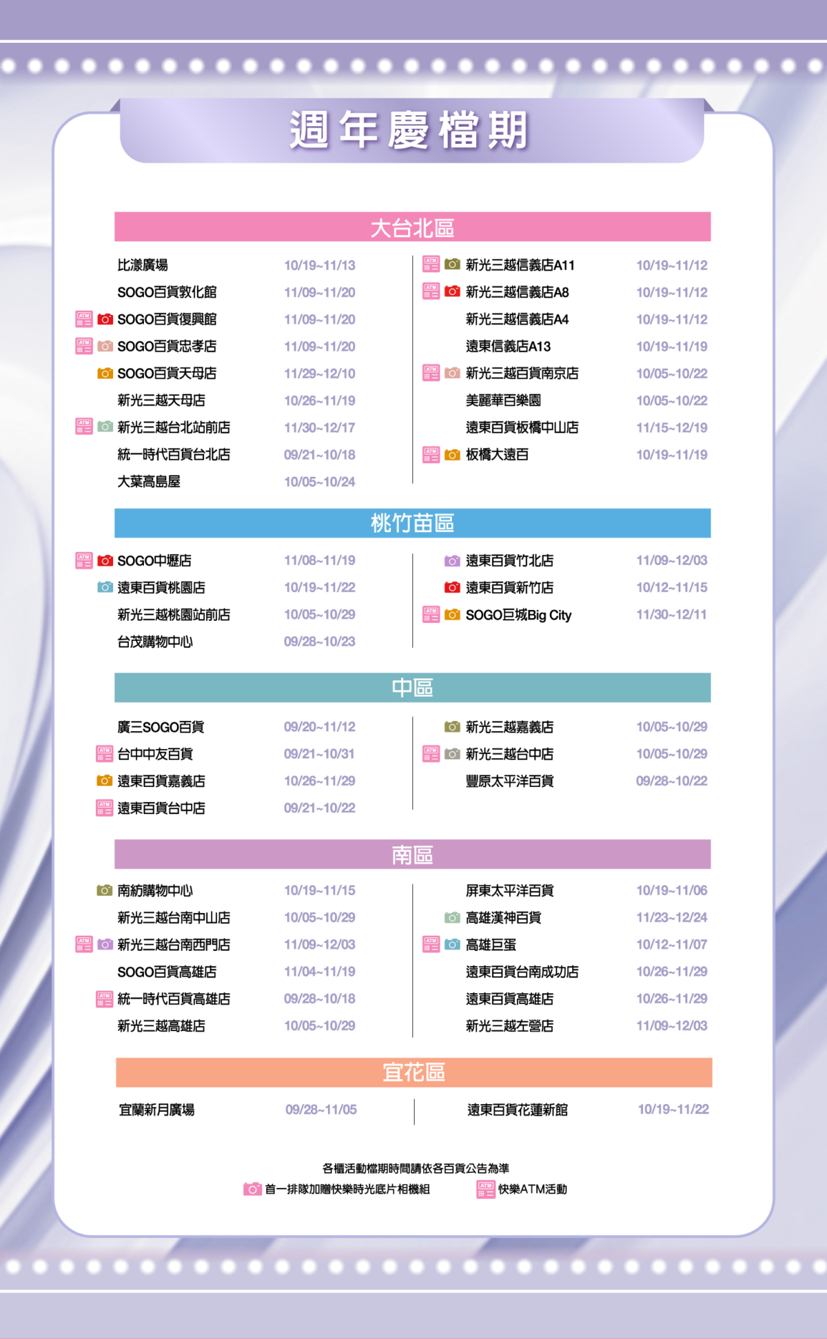 SOGO百貨復興館、SOGO百貨忠孝店、SOGO百貨天母店、新光三越台北站前店、新光三越信義A11、新光三越信義A8、新光三越南西店、板橋大遠百、SOGO中壢店、遠東百貨桃園店、遠東百貨竹北店、遠東百貨新竹店、SOGO巨城BIG CITY、遠東百貨嘉義店、新光三越嘉義店、新光三越台中店、南紡購物中心、新光三越台南西門店、高雄漢神百貨、高雄巨蛋。(各櫃時間以品牌公告為準。)