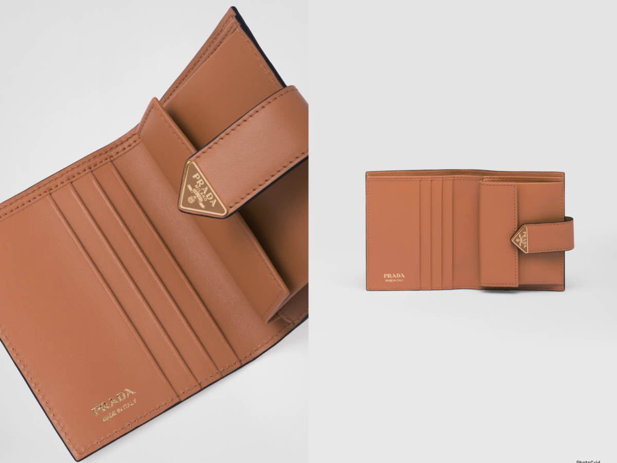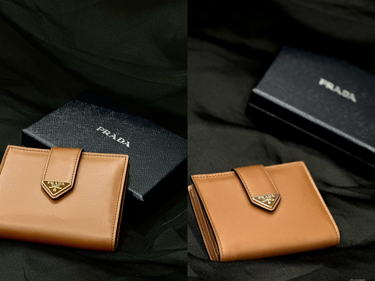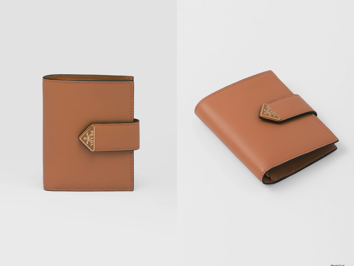Prada 干邑色皮革短錢包,參考定價NT$24,500。