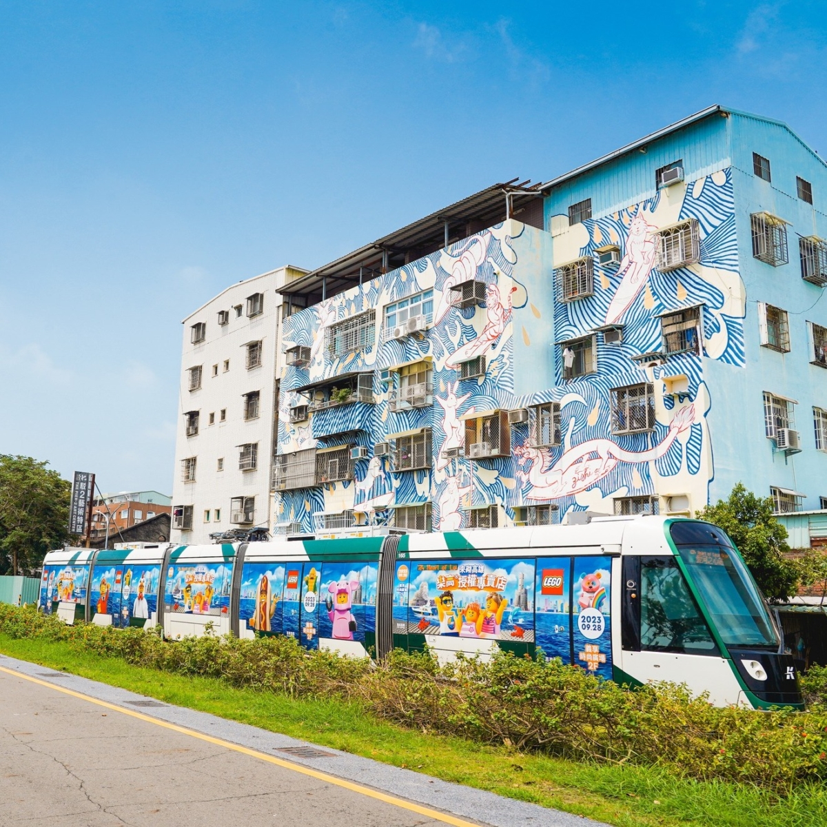 此外,高雄輕軌也因為樂高專賣店的開幕而變得更加繽紛可愛啦♡輕軌車身上彩繪了樂高小人偶的各種圖樣,飽和度超高的車身設計,車內還有各種關於樂高的冷知識,搭上這列彩繪輕軌,就可以沿途一邊欣賞高雄美景,一邊享受樂高氛圍!