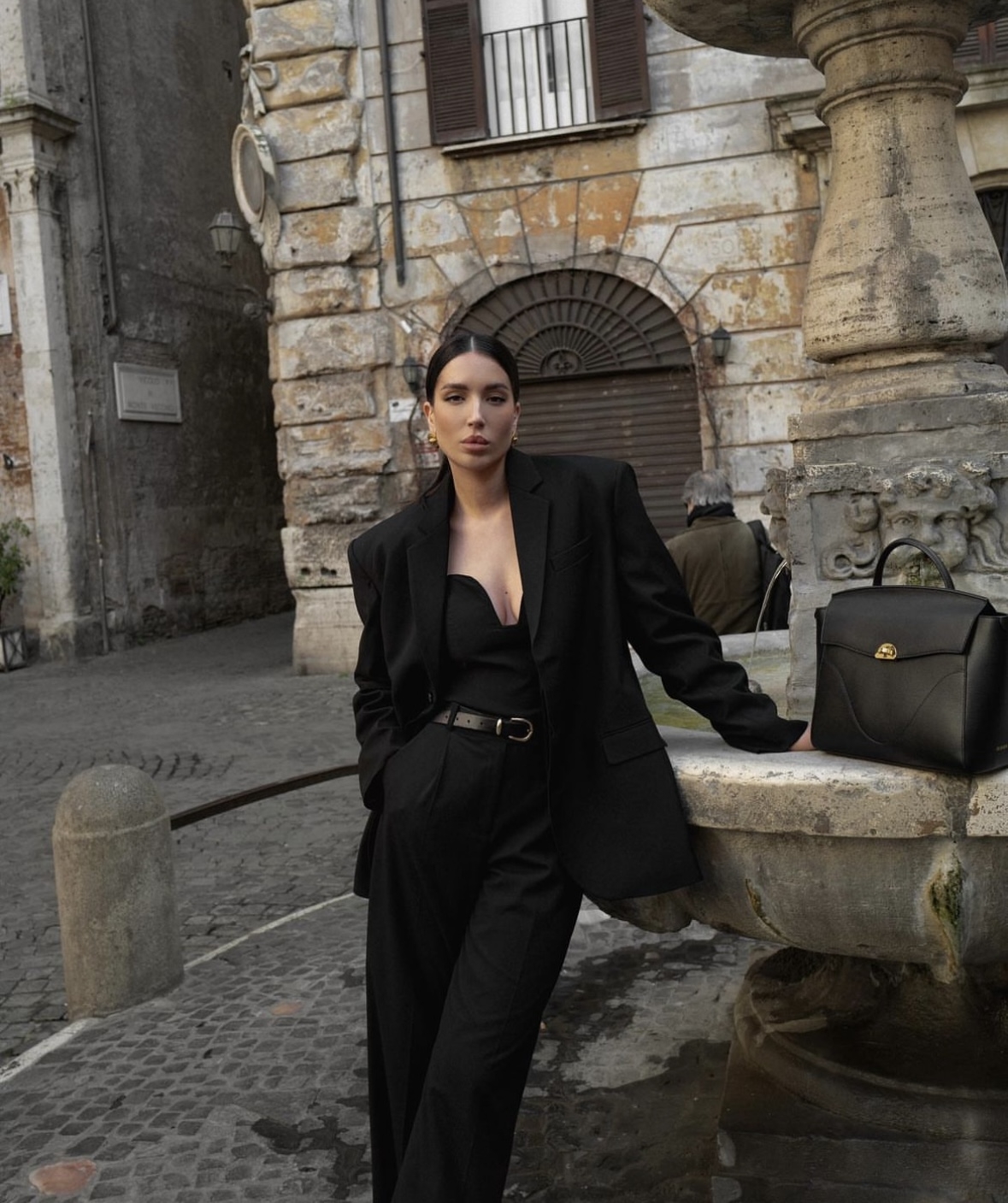 Fendi 的 FF Logo 設計不只應用在包上,連皮帶也精緻到不行,帶環和標誌性 FF 螺柱扣的薄腰帶,材質是由黑色皮革製成,點綴的剛好,不會過大也不會沒有辨識度,很適合像模特這樣搭優雅裙裝,更顯質感!