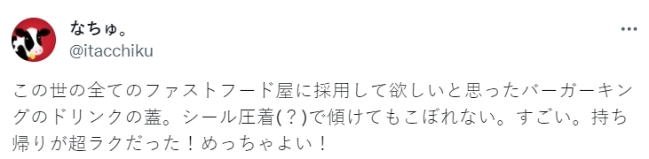 日本網友最近在漢堡王買到了一款被塑膠封膜的外帶飲料,讓他驚呼:「我希望全世界上所有的速食店都能採用像是漢堡王這一種飲料設計。它是用一種密封的捲曲壓製技術(?),因此即使怎麼樣傾斜飲料也都不會溢出來。超驚人的,只要有這個封膜,要把飲料帶回家超簡單!超棒的設計!」