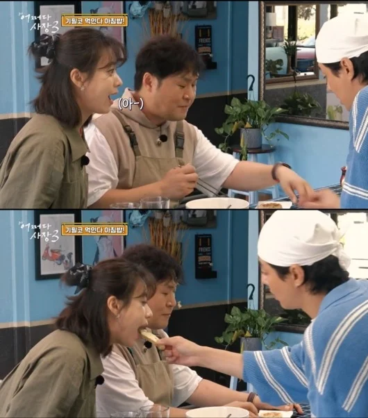 早上忙碌一段時間後,趙寅成、韓孝周、尹敬浩在吧檯稍作休息吃東西補充體力。就在此時,韓孝周眨著大眼睛對著趙寅成張開嘴巴說:「啊~」而趙寅成也立馬將手中的蛋捲喂進「老婆」嘴裡~是説你們有考慮過尹敬浩的感受嗎...他連頭都不敢抬啊XDD