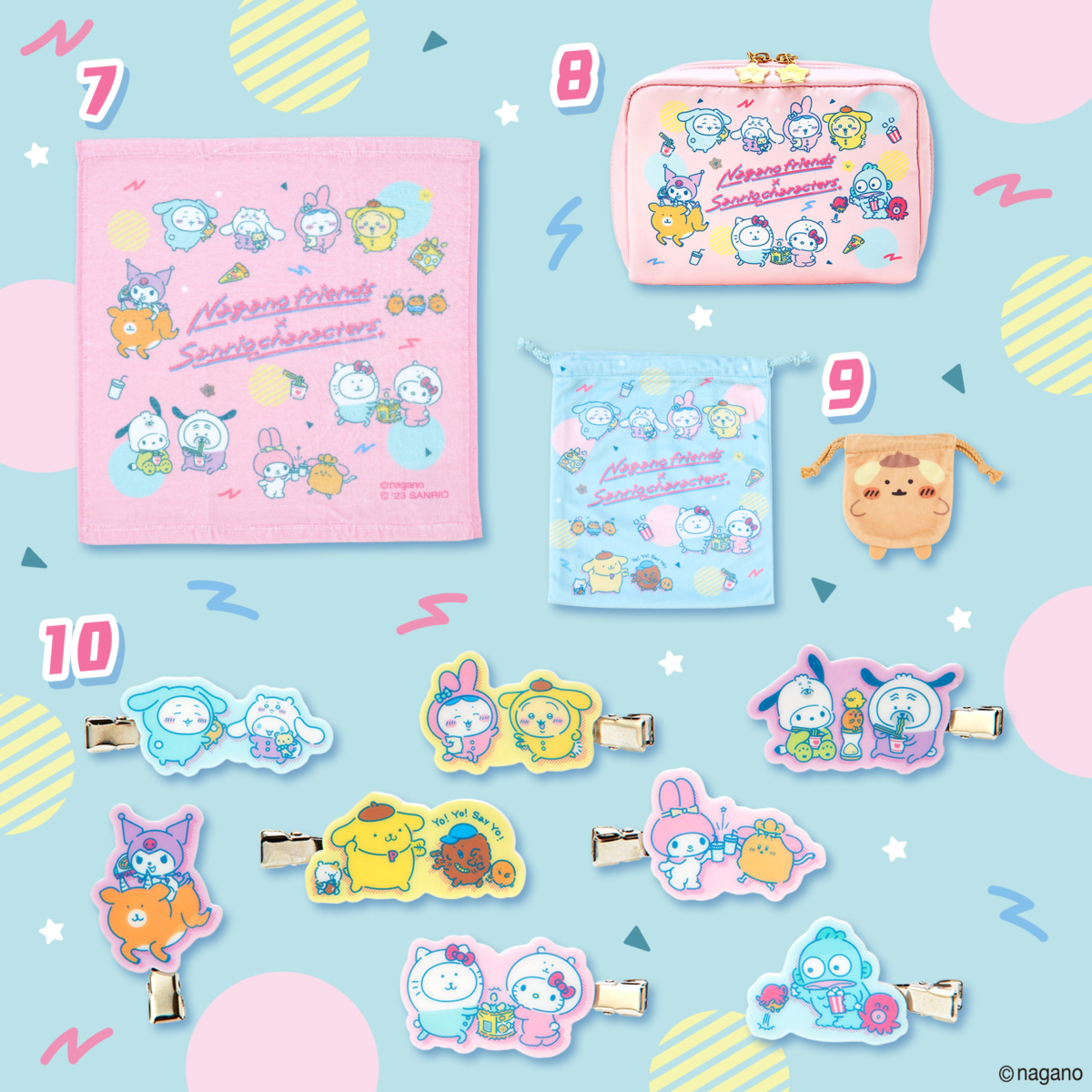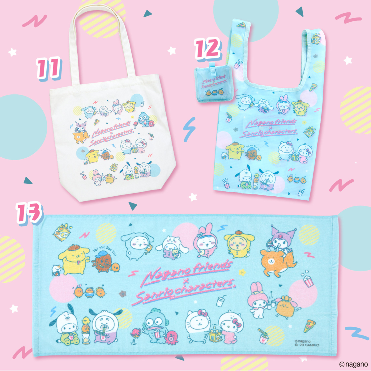 不只如此,Nagano Friends×Sanrio還推出了許多實用的日常生活用品、裝飾品像是化妝包、毛巾、購物袋、小束口帶等等,更可愛的是,這些商品上的圖案都是吉伊卡哇、小夥伴們與三麗鷗角色分餅乾、吃泡麵、乾杯等互動!