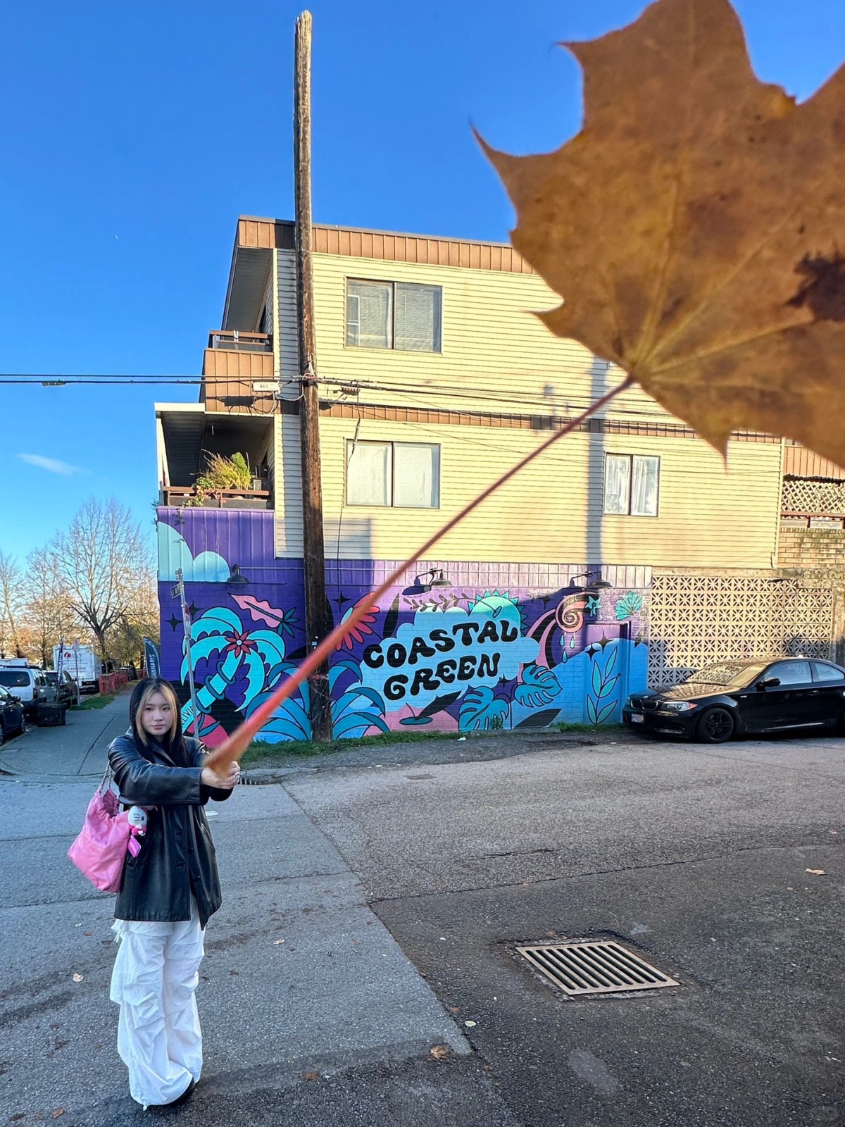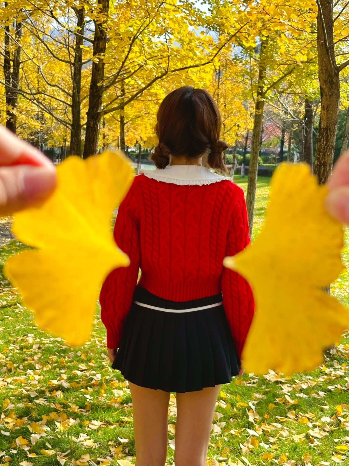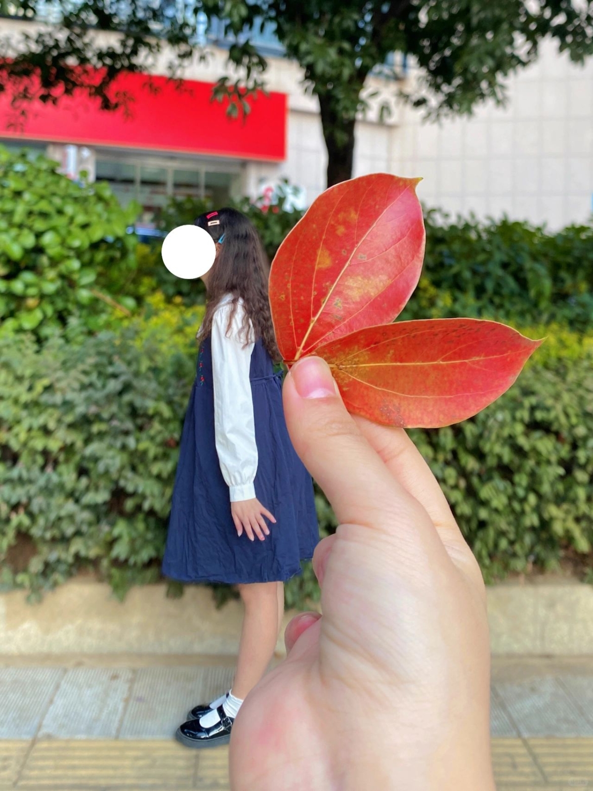 要學習這些拍照姿勢都是需要朋友幫忙的喔!首先要先撿一個你喜歡的落葉,接著把手機的相機開啟大約0.5~0.6倍的廣角,請朋友將落葉的一小角捏住靠近鏡頭,站約1公尺的距離,手呈現抓著的姿勢對準葉柄來借位就完成啦~快和朋友互相幫忙拍♡