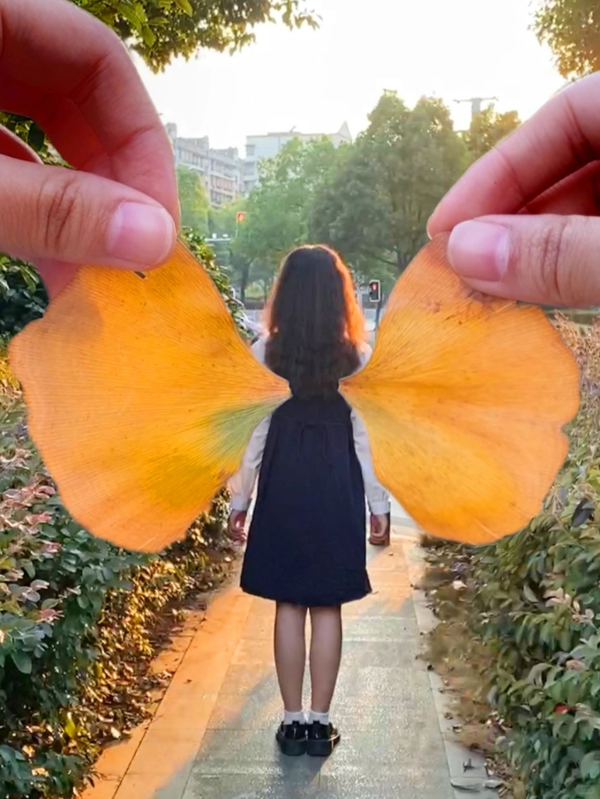 最後分享超可愛的落葉翅膀照~找兩片形狀相似的葉子,請兩位朋友幫忙,一人雙手左右各捏住葉子上方的邊緣對齊你的背,最後一個人只要按下快門就行囉!超特別的落葉拍法讓你一秒成為「秋季小仙子」♡