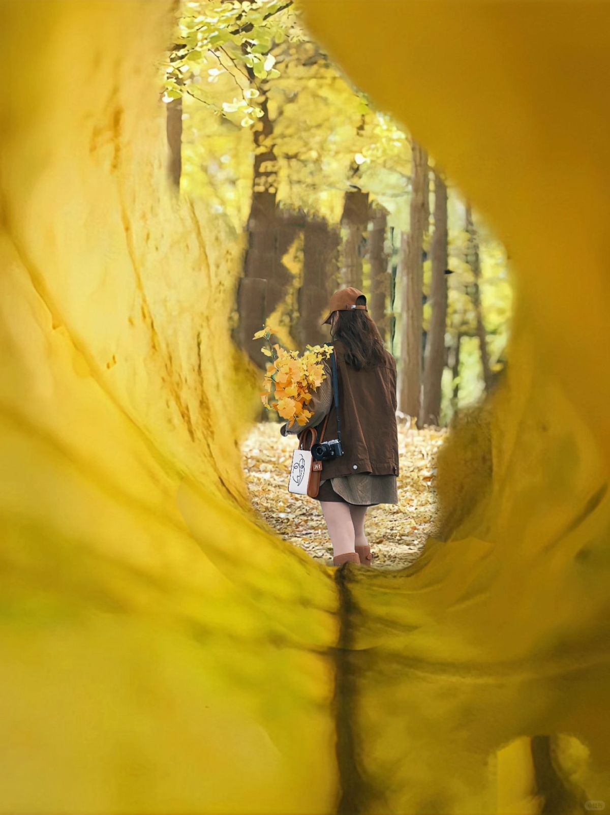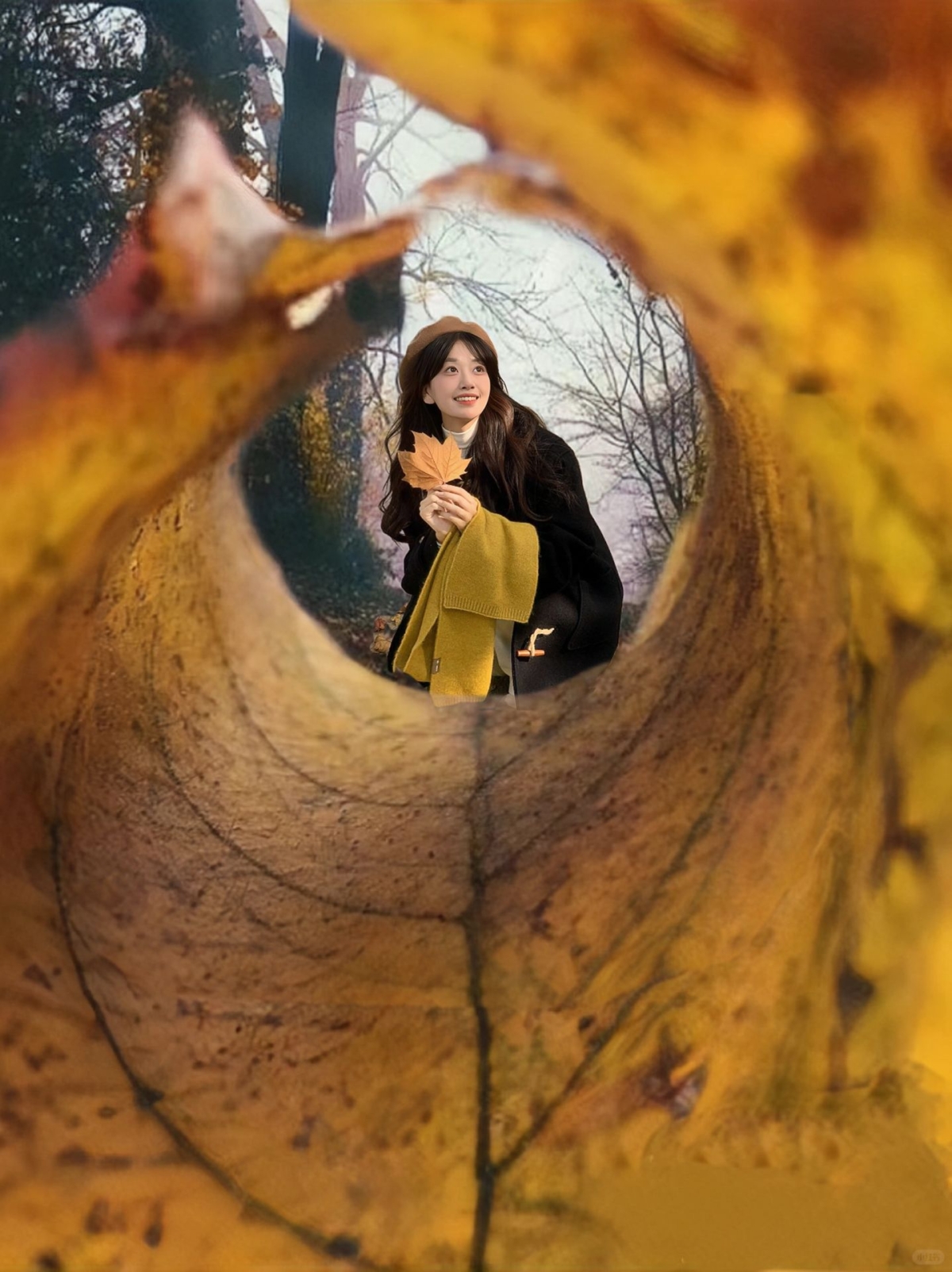 想拍出意境滿滿的落葉照,這種絕對要學!選一片偏枯黃的落葉,依據想要的形狀捲起來,中空的部分對準鏡頭就可以拍了~人管近拍還是遠拍都好看,尤其照片呈現從鏡頭穿過去像隧道一樣的感覺,還有斑駁的紋路,看起來相當高級。