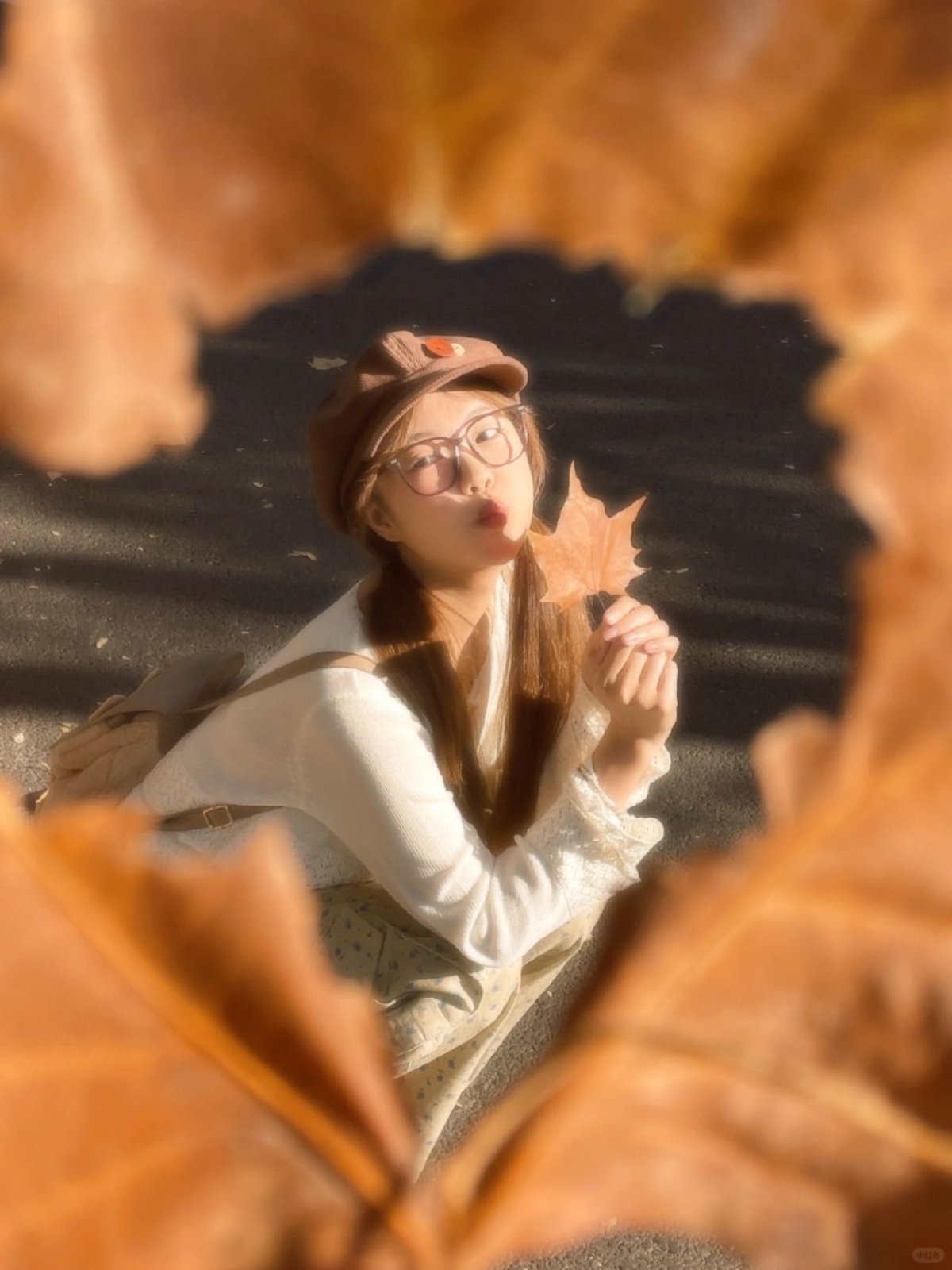 和把落葉捲起來累似的拍攝還有這種「破洞落葉照」,將落葉戳破一個洞,放在鏡頭前就完成了~雖然沒有像捲起來那麼有立體感,但就像是套用了濾鏡一樣,讓看照片的人有從落葉破出看到你的感覺!