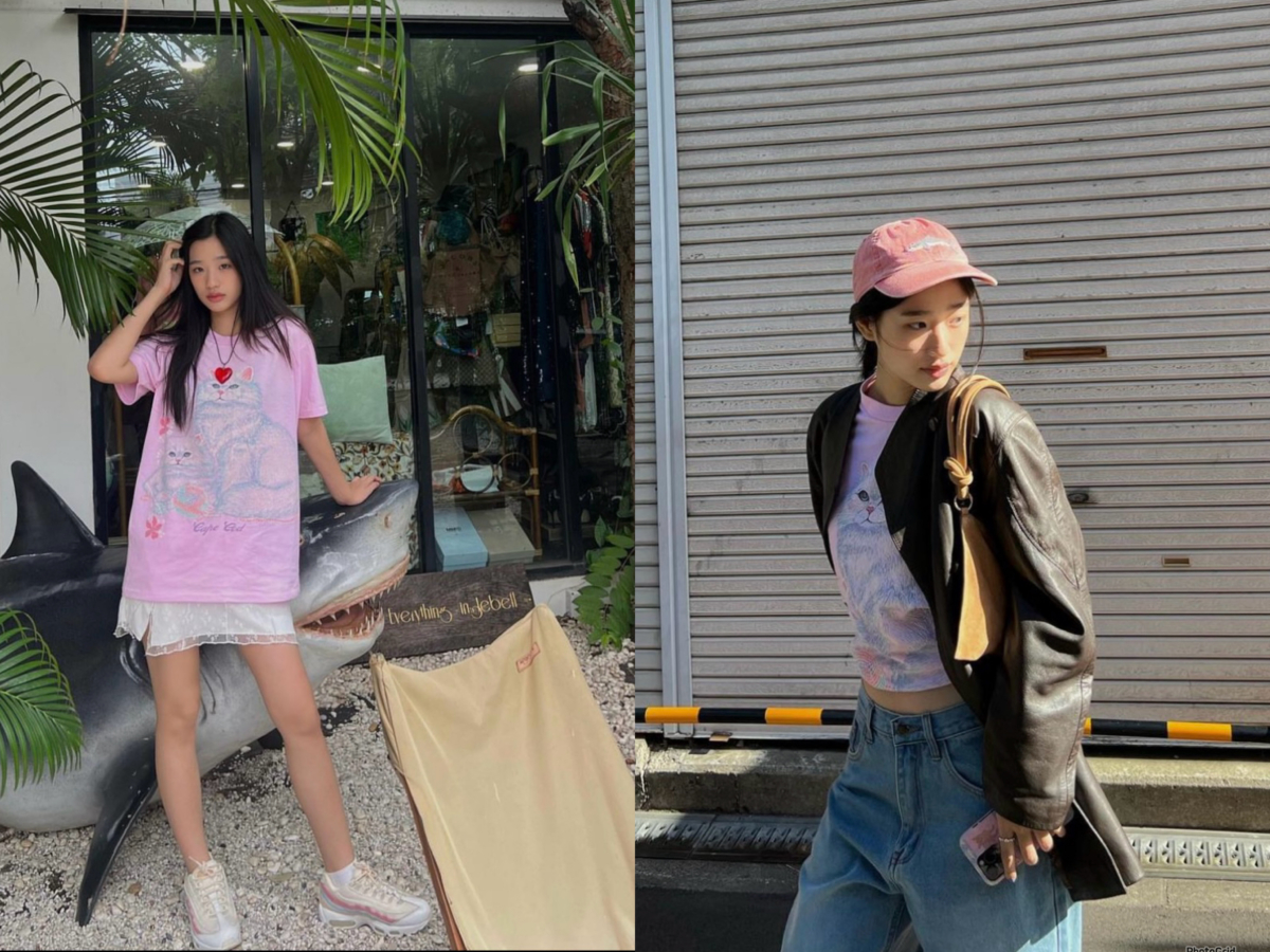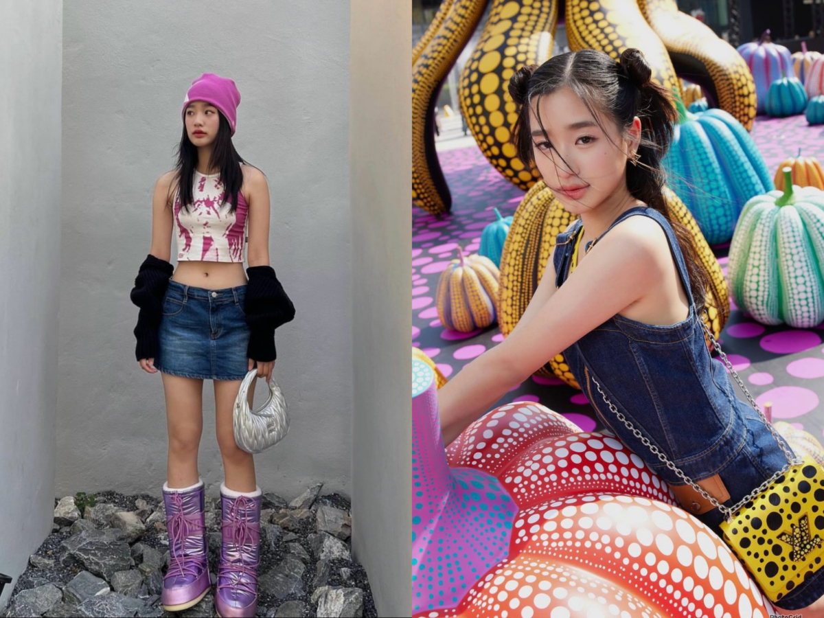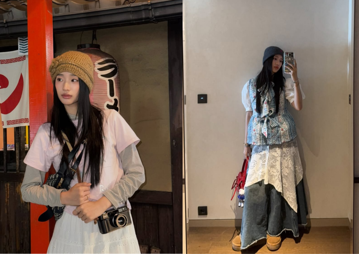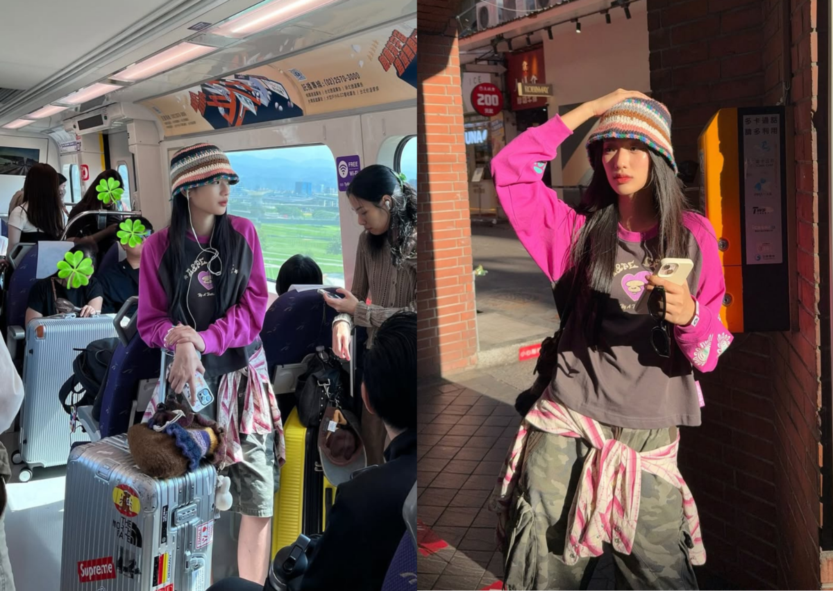 身為青春少女,自然少不了夢幻粉色的點綴!寬大 Oversize 毛衣、短板上衣,還有著濃濃Y2K元素的泡泡襪、毛靴、袖套、低腰短裙和牛仔穿搭,雖然是個時尚精品的寵兒,私底下還是個愛追星的小迷妹,穿著一身粉紅休閒服,高舉偶像應援牌,露出她興奮期待的小女孩樣,瞬間圈粉!