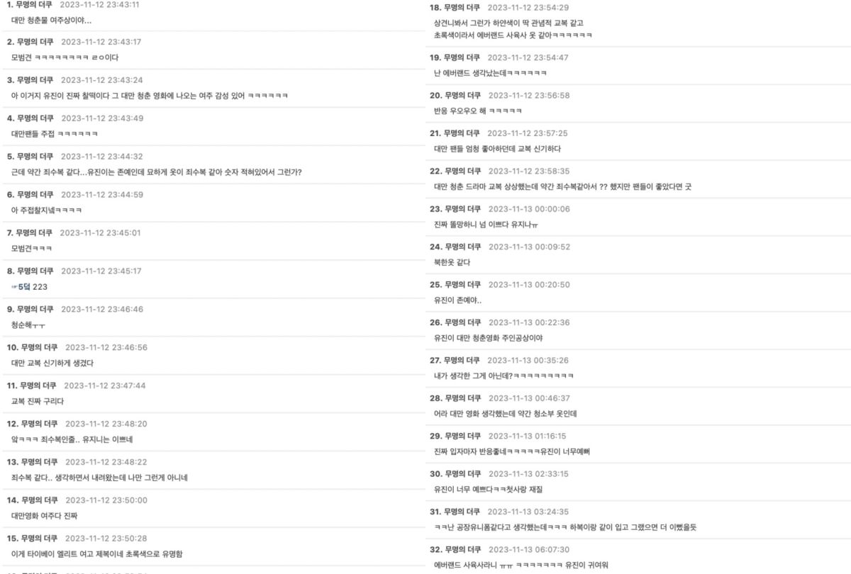不過留言的似乎出現讓台灣粉絲感到意外的話,許多韓國網友說:「好像囚服啊...上面還有數字什麼的 」、「覺得臺灣校服很神奇,有點微妙」、「可能是因為《想見你》,所以覺得校服應該是要白色的樣子,綠色的話像是愛寶樂園飼養員的制服哈哈哈」、「以為是像臺灣青春電影中校服的樣子,但有點像囚服 ??」不過也有網友幫忙解釋與表示:「真的很適合兪眞!有臺灣青春電影女主角的感覺」、「臺北第一女子高中的制服啊,綠色樣式很有名的」、「如果粉絲們喜歡的話就好」、「雖然跟我想像中的不太一樣,但俞真穿上去就變很好看」。
