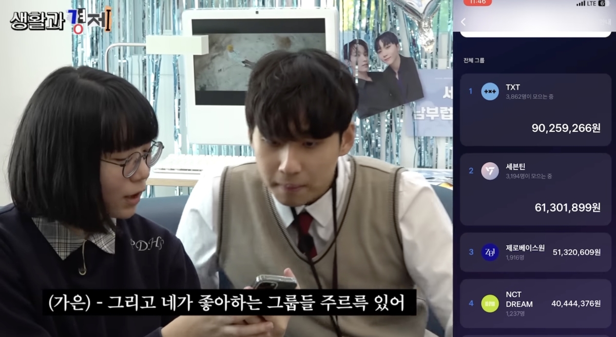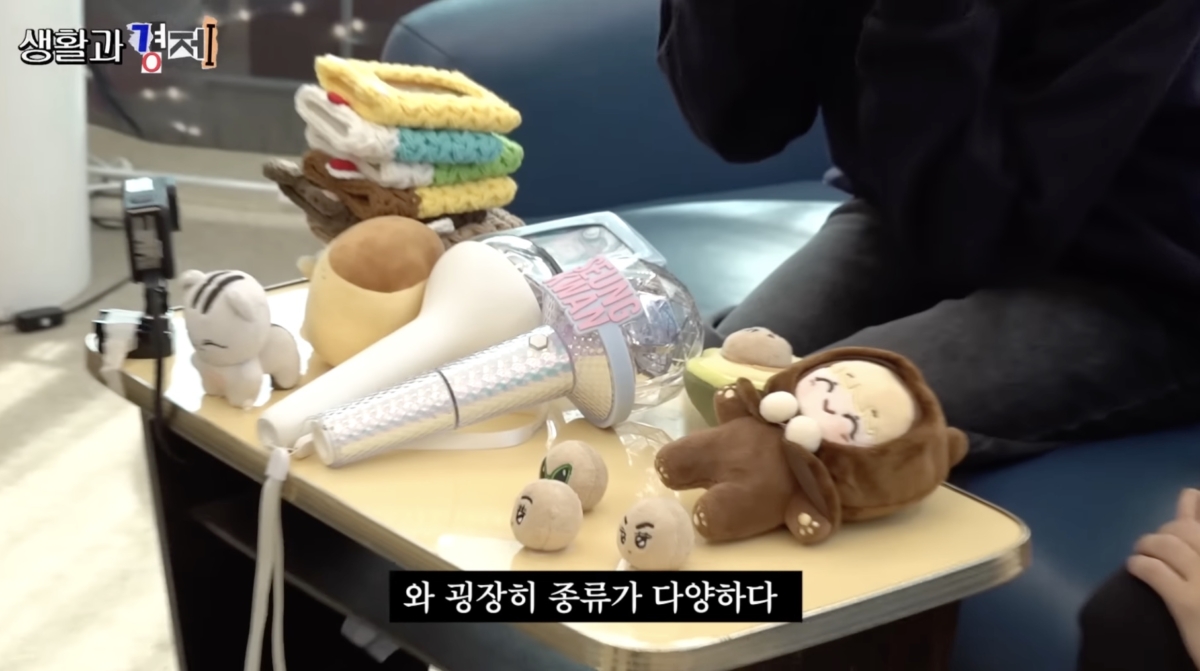 而韓國近期卻有一個YouTube節目「생활과 경제(生活與經濟)」,訪問一位男團SEVENTEEN的高中生粉絲,向她了解K-POP迷妹們日常追星生活模式。節目其中一段,粉絲向主持人展示追星收藏的戰利品,包括:專輯、不同代應援手燈、不同通路小卡、偶像娃娃等等,超多樣化的商品讓主持人對追星族的消費感到驚訝。