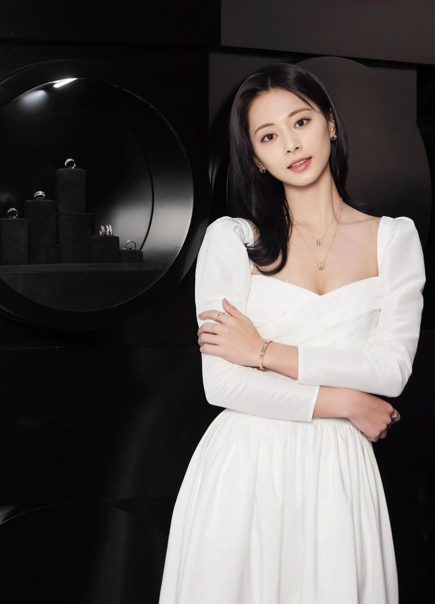 很少出席活動的韓國人氣女團 TWICE 成員周子瑜也現身活動上,以一身優雅潔白的復古公主袖抽皺洋裝,佩戴 DAMIANI Belle Époque Reel 系列18K白金耳環、18K黃金手環、兩款項鍊,