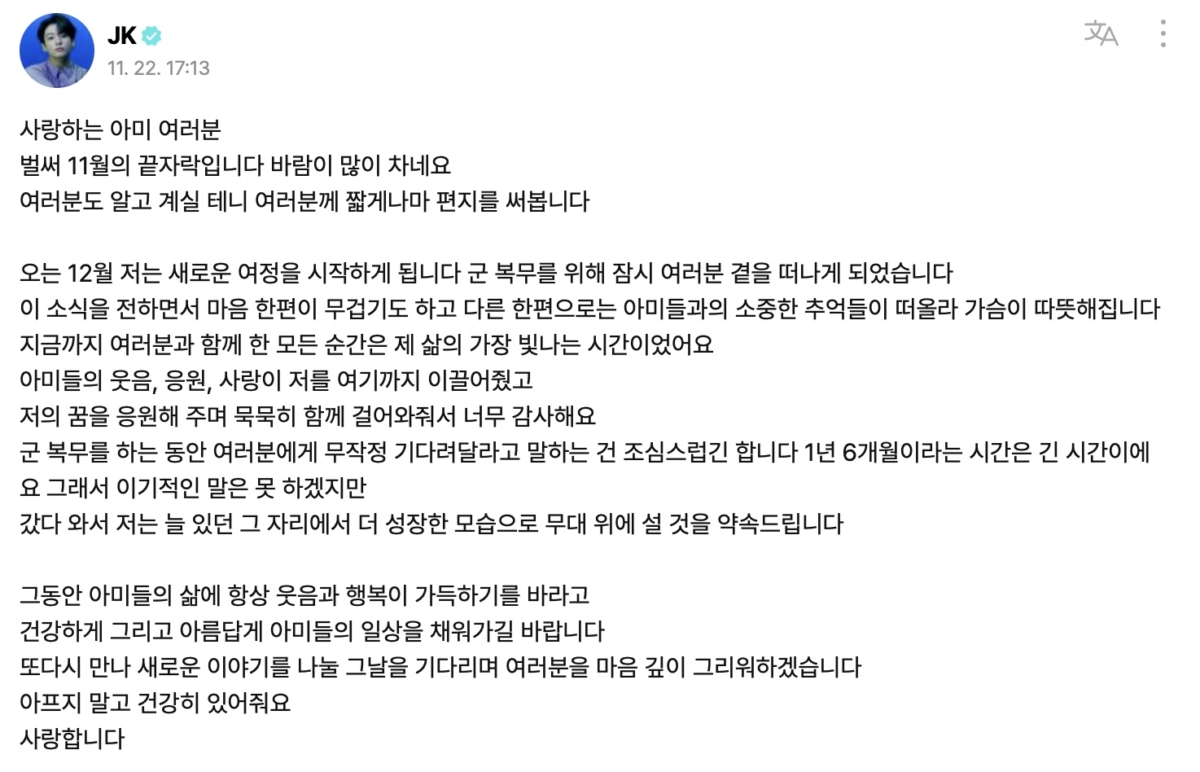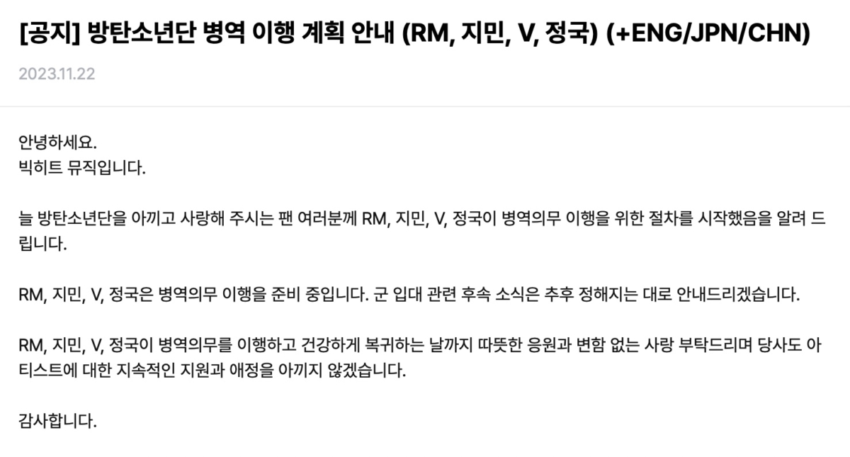 韓國法律規定,全國身體健全的男性需要完成18至21個月的兵役,因此韓國偶像天團BTS也不得不面臨「軍隊空白期」,繼2022年成員Jin選擇撤回延期請求並入伍後,2023年成員J-Hope、Suga也跟進入伍。而就在22日,經紀公司BIGHIT MUSIC發布公告,表示剩下的成員RM、Jimin、V、柾國正在為履行兵役做準備,消息一出,許多粉絲都超級不捨,成員柾國也親自發文向粉絲喊話。