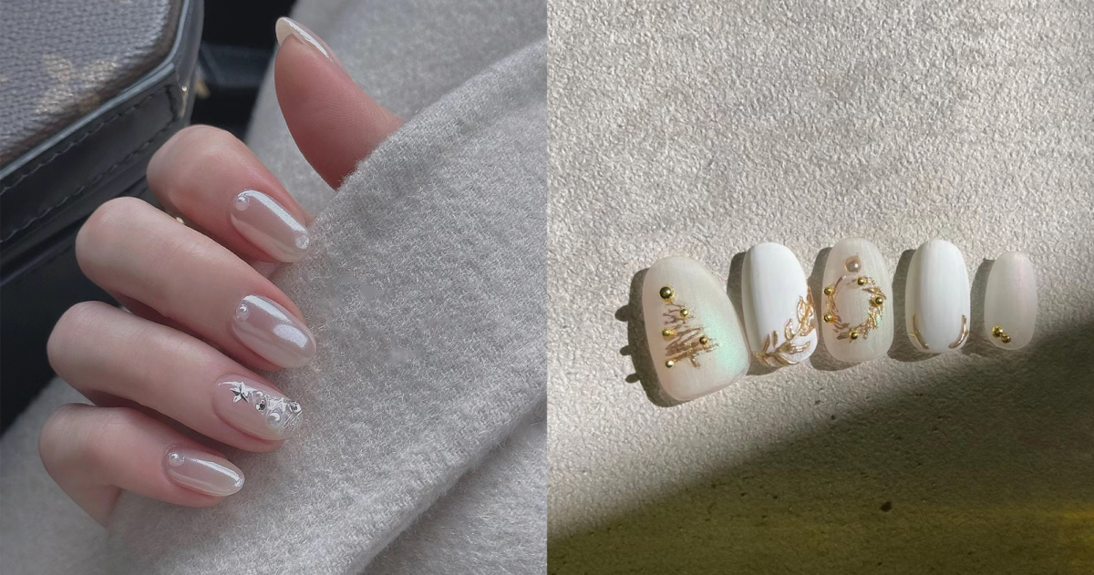 如果想要雙手更豐富多彩,也可以考慮選擇搭配亮粉或貓眼款式,透過白透粉的底色加上亮粉呈現出類似珍珠的光澤,簡單大氣除了適合過節,加上小珍珠做點綴出席正式場合也沒問題!精緻又不易撞款,無論年底參加什麼派對活動都能完美搭配!
