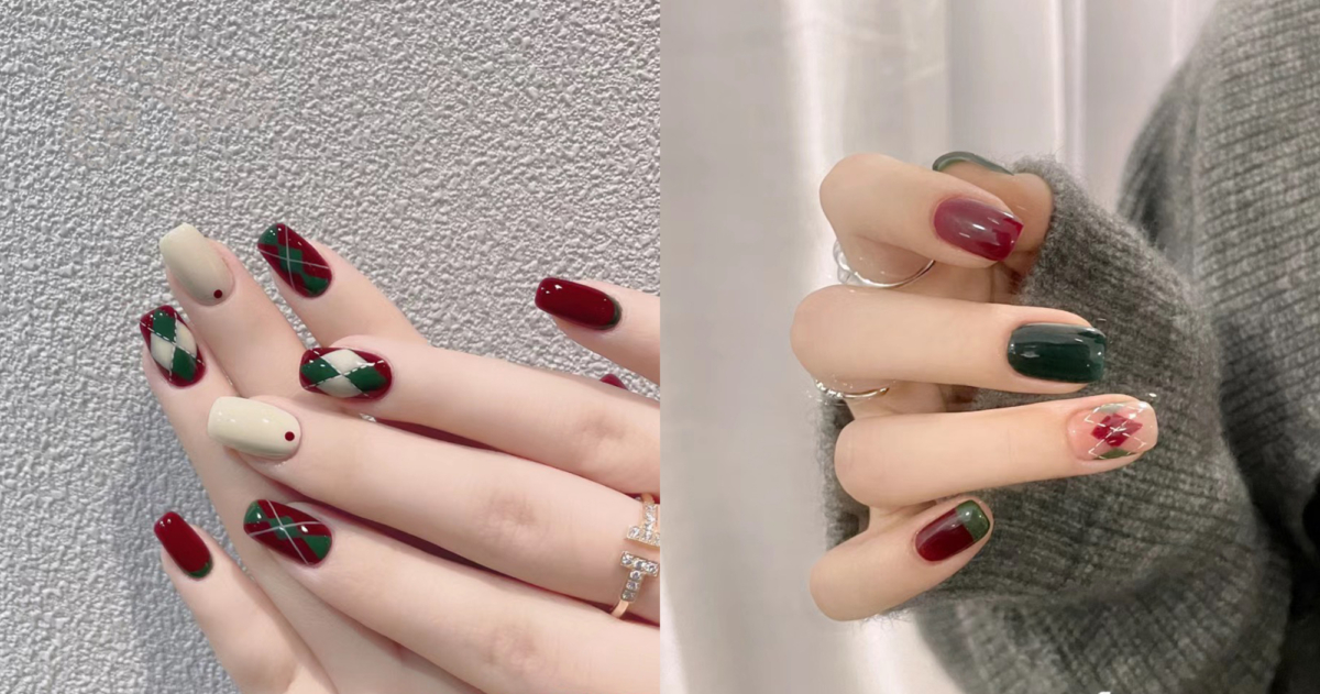 如果不喜歡用各種可愛元素來裝飾美甲,「菱格紋」也會是一個很好的選擇,在指甲上繪製出紅色和綠色的交叉菱格紋,營造出濃厚的節慶氛圍,「菱格紋」自帶的書院氣質也讓指尖散發典雅又不失可愛的風格,絕對能在聖誕派對上成為焦點!