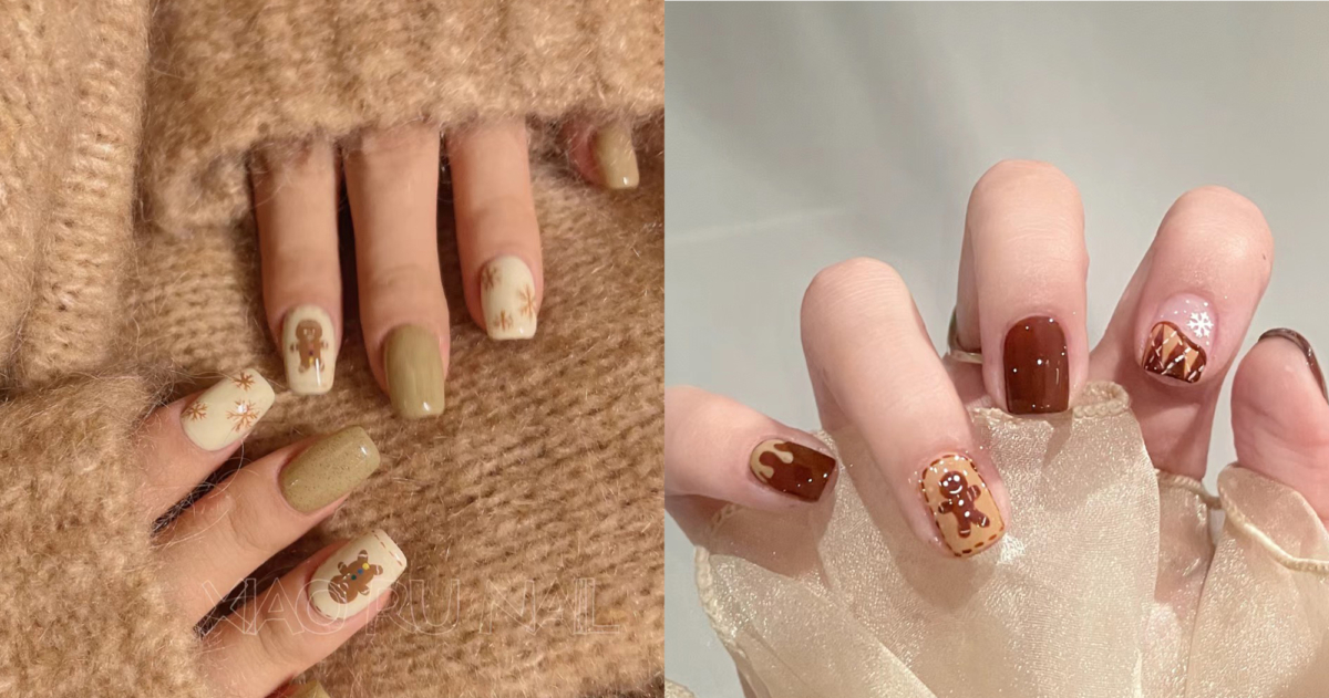 除了聖誕樹、紅色聖誕老公公,打造一雙超可愛的薑餅人指甲也能為節日增色不少!挑個淺棕或米色當底色,整體奶呼呼的款式也能跟上時下的美拉德風潮,除了在指尖畫出薑餅人的形狀,也可以增添各種聖誕元素搭配,作為日常款超級可愛也很百搭!