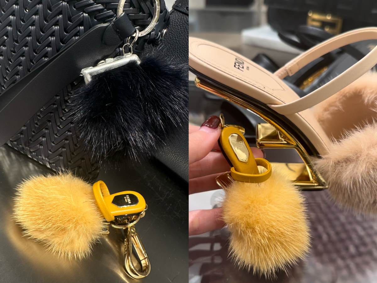 這顆 Fendi First 真的燒到我了!竟然是縮小版尺寸的吊墜,採用粉紅色、藍色和黃色水貂毛製成,可以扣在包款上當作吊飾,也可以隨意搭配疊搭,從外型、毛料到金屬扣環的精緻細節跟真正的包款一模一樣,開口處也可以真的打開唷!