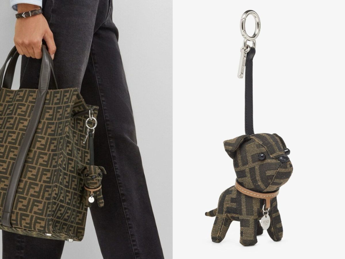 繼上次從 Fendi 男裝區找到的小飯糰包,這次再次發現了老花狗狗吊飾,以棕色和菸草FF提花面料製成,黑色和米色的皮革細節都呈現出高質感,除了經典老花標誌一眼就能辨識之外,狗狗身上的金屬項圈吊牌上也寫上品牌字樣。