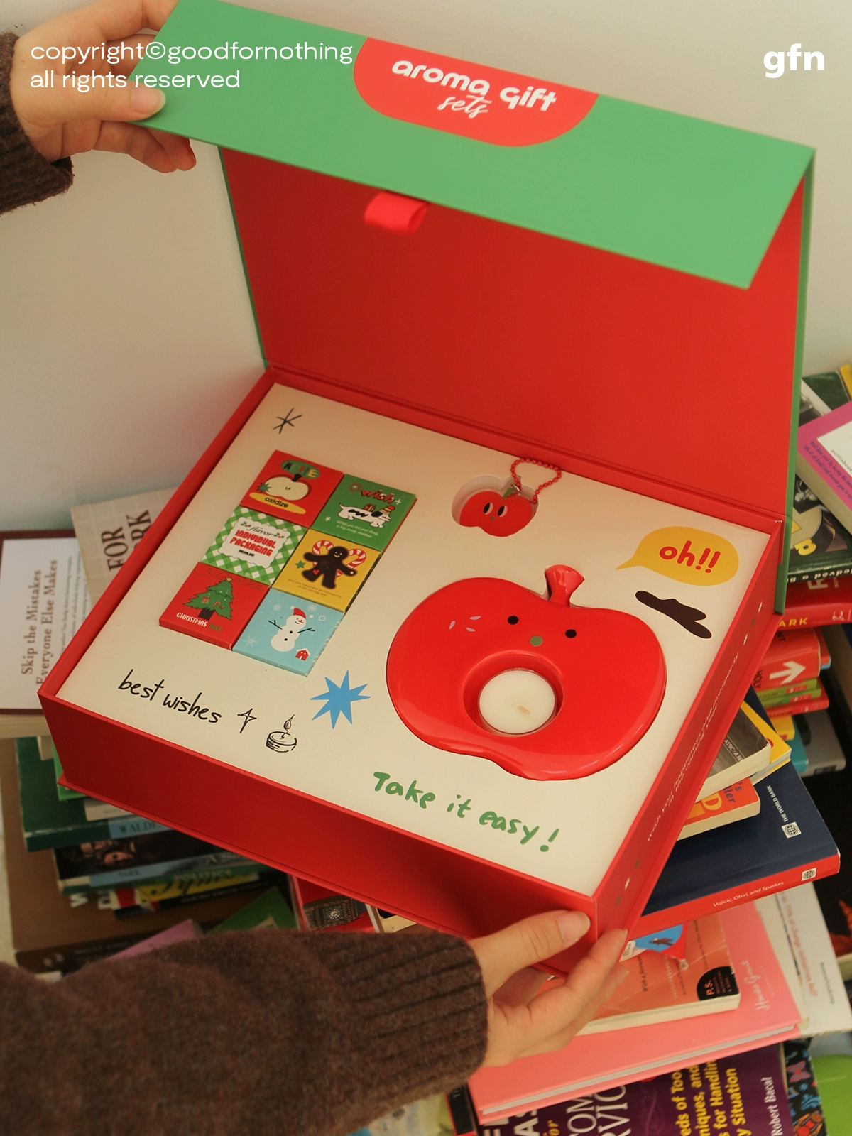 原創品牌「goodfornothing」設計過的商品都在網路上獲得許多網友的好評,之前情人節推出的「蘋果香薰蠟燭」更是引起熱賣潮,因此今年聖誕節就推出「尖叫蘋果聖誕禮盒」!超值的內容包含蘋果陶瓷底盤、6種香味小蠟燭、蘋果壓克力吊飾以及環保針織袋。