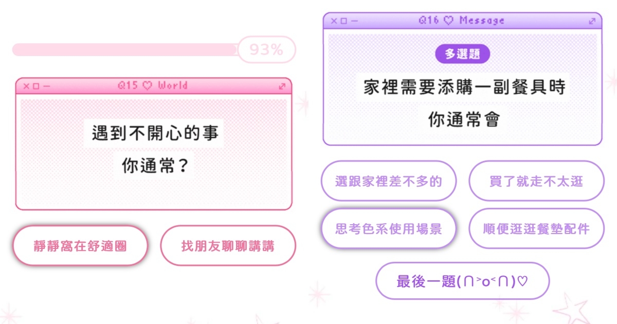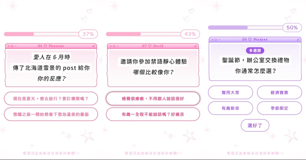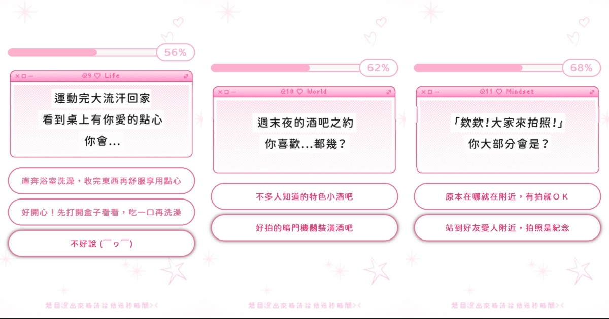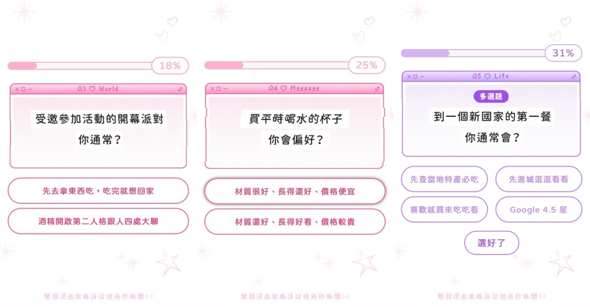 每個問題的頁面都會像是電腦跑視窗的動態影像,這風格是不是很可愛!!這12題當中其實都是在測你有沒有「浪漫因子」,正如同展覽所說的「保有浪漫因子,再平凡的日常都可以過成講究的日子」♡