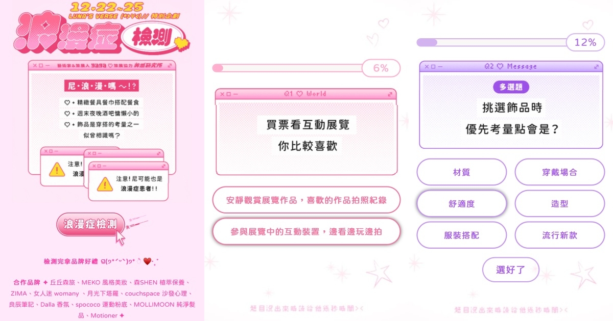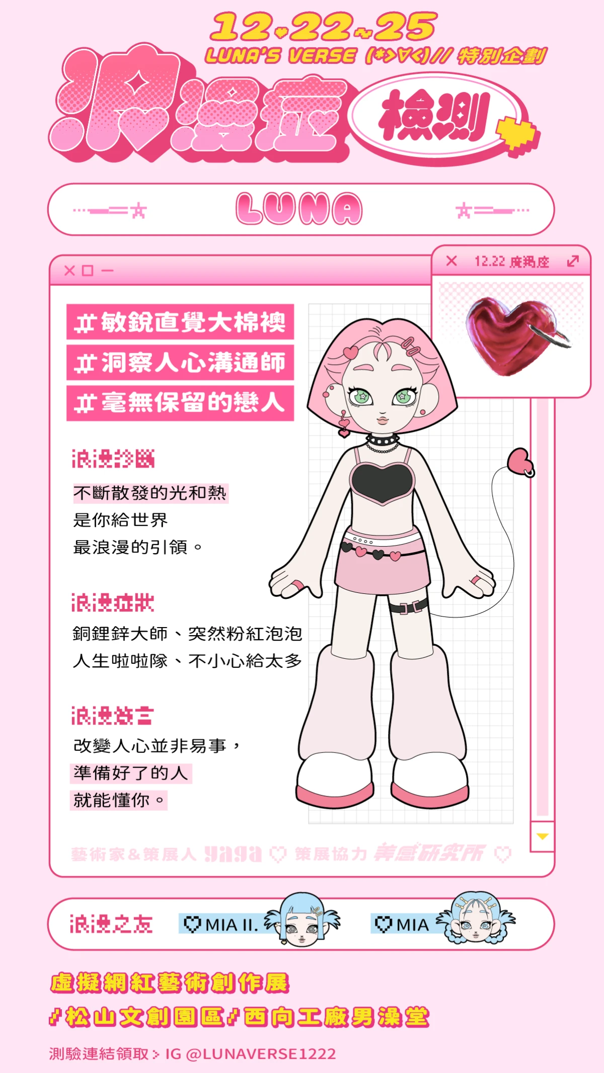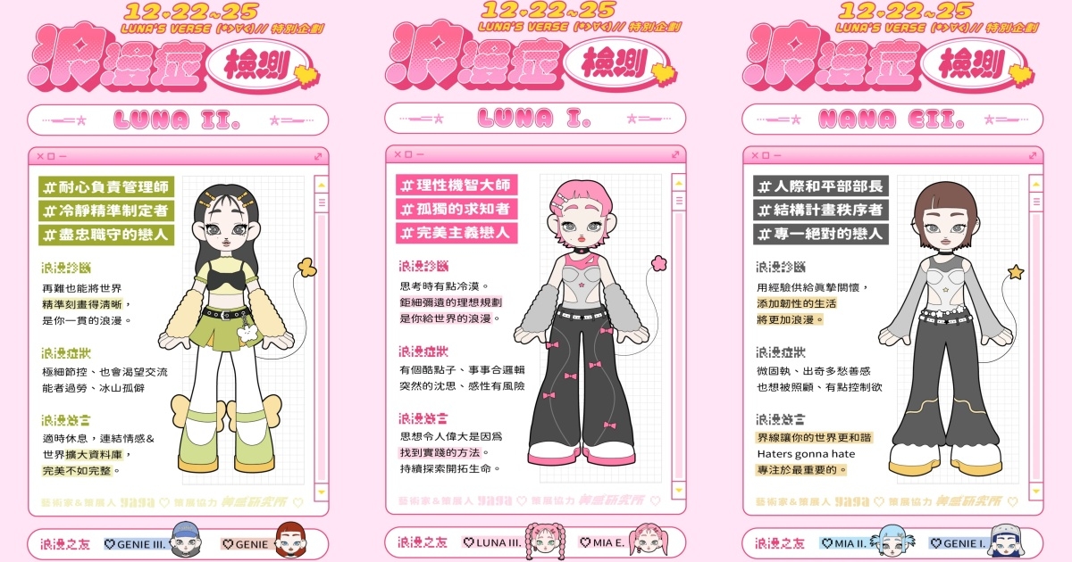 這款「浪漫症檢測」是由3D視覺工作室「yaga.studio_」所設計,是年底位於松菸展覽「浪漫症候群 Luna’s verse ⋆ ˚。⋆୨୧˚」的其中一個可愛活動,圖中主角則是展覽的主要人物:Luna、Mia、Genie 及 Nana,四位虛擬網紅都有不同的風格,大家可以測測看屬於你的角色是誰!
