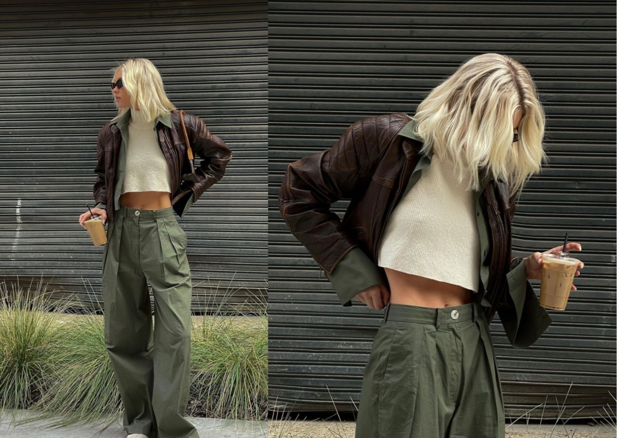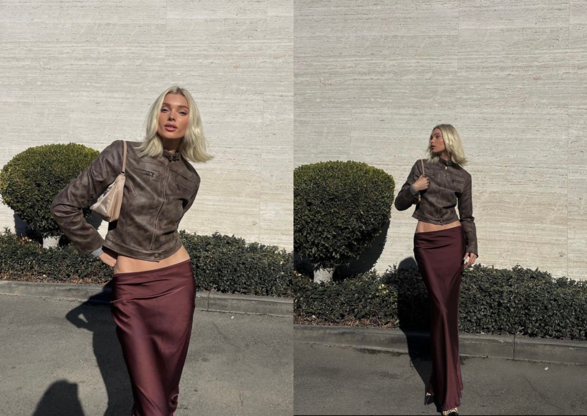 接下來要介紹的這位,是在 IG 上坐擁 871 萬粉絲的瑞典人氣模特兒 Elsa Hosk,每每發出的穿搭照都忍不住讓人多看一眼,私下也經常以皮衣做為搭配,偏愛「復古刷色棕色皮衣」,相較於黑色皮革給人俐落帥氣的印象,帶有仿舊感的棕色調,有著水洗褪色的特性,保留了皮衣原本的冷酷感,卻又有些感性,短版皮夾克更多了些街頭、俐落風,Elsa 以皮革材質搭配緞面裙更有著意外的衝突美感!