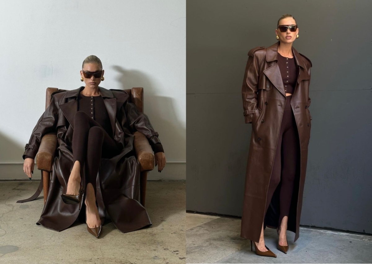 皮革風衣外套無疑是秋冬最性感的時尚趨勢,在時尚圈上占據重要地位,被應用在外套、褲長褲任何單品上,穩坐引領時尚地位的 BLACKPINK ROSE 出席 2023秋冬時裝周時就穿著 Saint Laurent 淺亞麻棕皮革風衣,寬大肩線和線條搭配黑短版小洋裝、黑色絲襪,呈現一股霸氣卻又不失性感的態度。