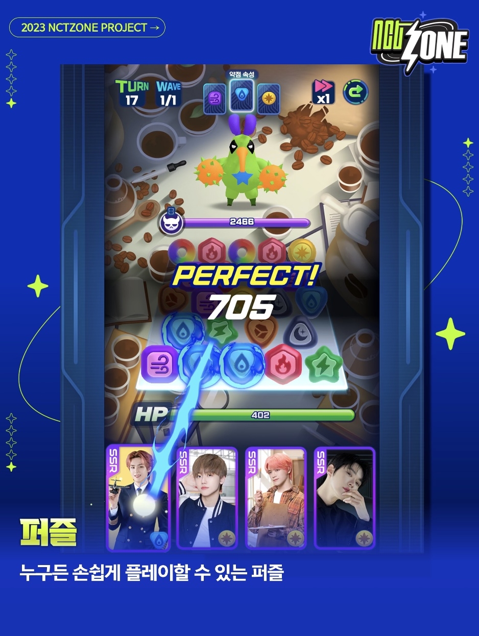 《NCT Zone》是一款成員卡牌組成的益智型戰鬥冒險遊戲,玩家必須將相同屬性的積木消除,利用不同卡牌等級與功能對抗、淨化噩夢。