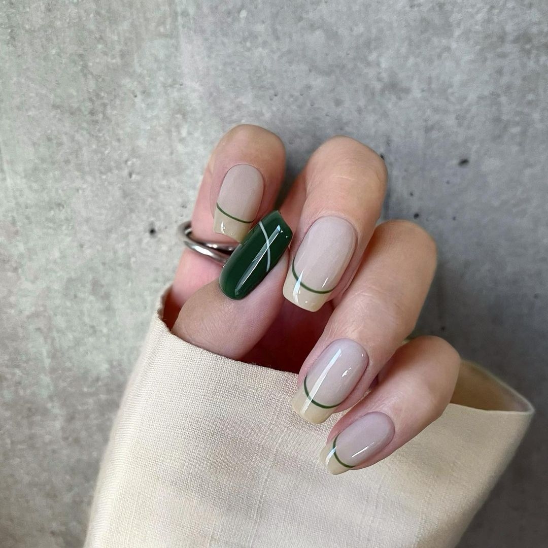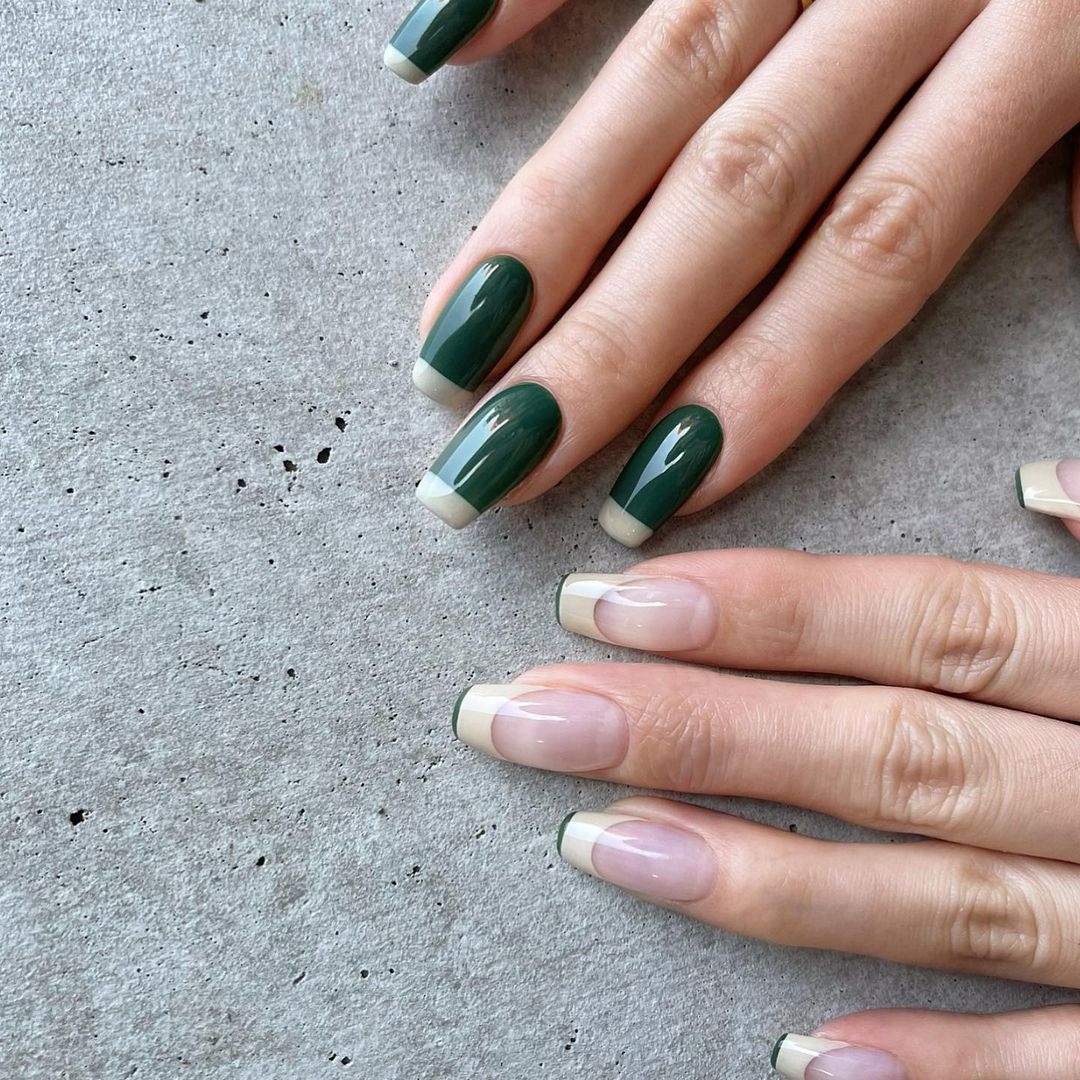 聖誕節就很適合做一組綠色法式美甲來應景一下,由墨綠色代表著標誌性的聖誕樹,加上溫柔的奶茶色,營造出濃濃的冬日溫暖感,既簡單優雅又自然清新。
