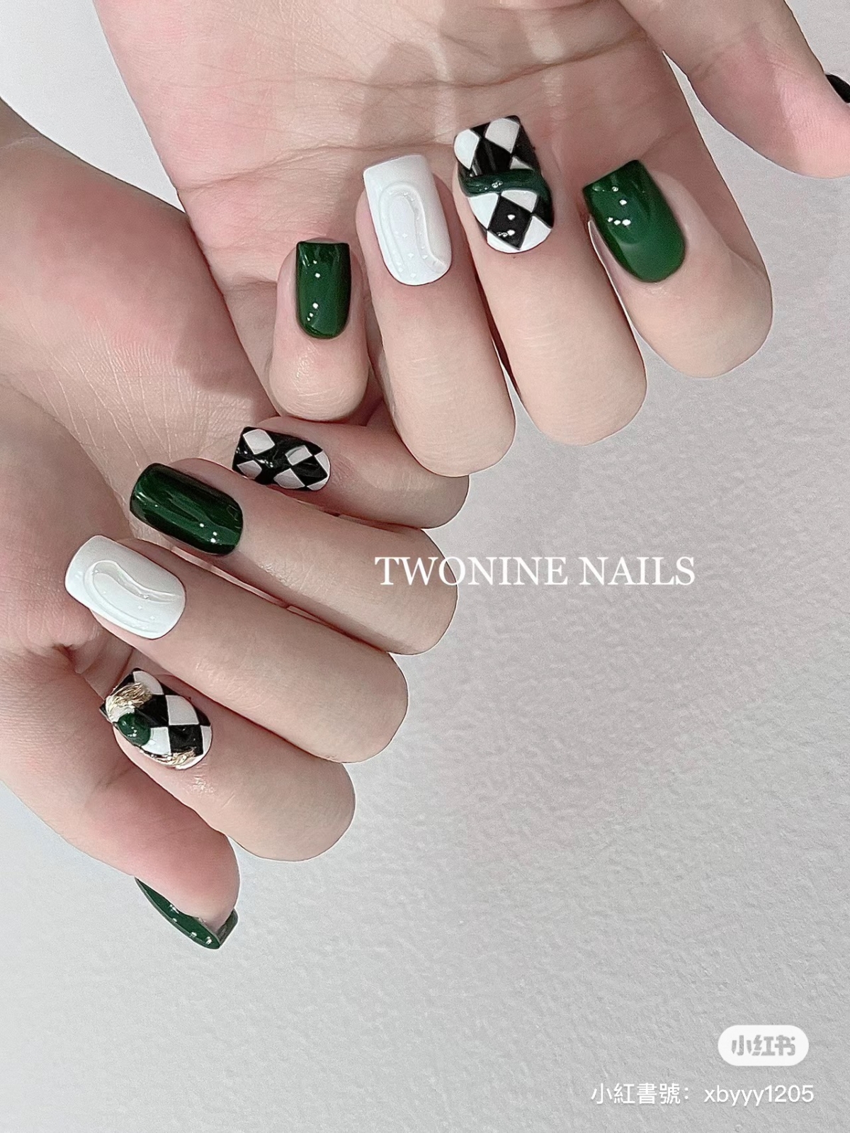 由黑、白、綠所組成的棋盤格美甲自帶前衛時髦風格,想要有別於日常款,可以在甲面上設計不規則的立體造型,既保留了棋盤格美甲的個性,同時又注入了節慶的活潑感,也展現出對美甲獨特品味。