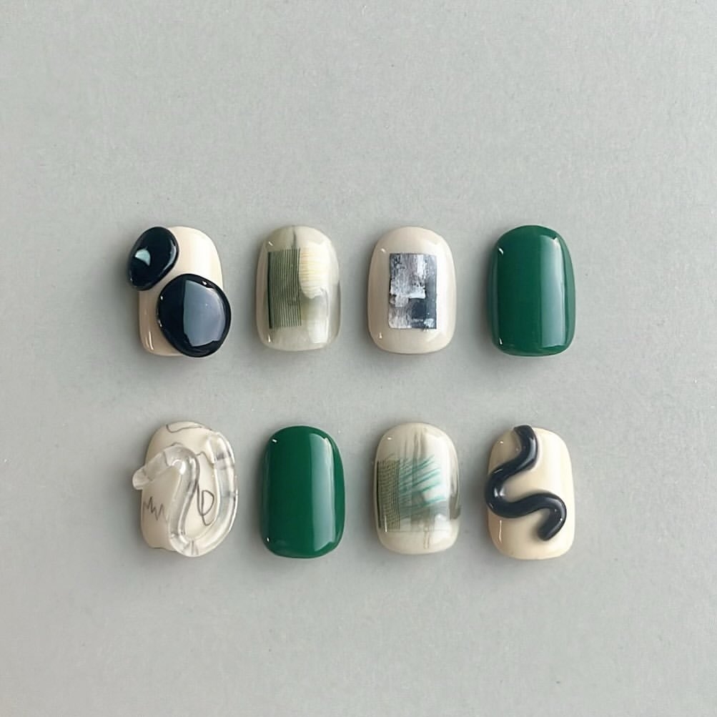 以聖誕綠色為主調,透過簡單而精緻的幾何圖案,營造出一種現代感十足的美感。這個設計不僅注重色彩的搭配,還融入了抽象而富有層次感的圖形元素,使指甲在視覺上更加豐富有趣。