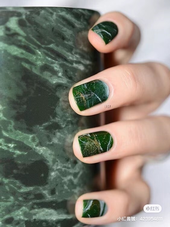 低調「聖誕綠」美甲06:大理石紋X聖誕綠