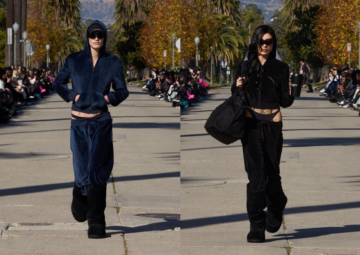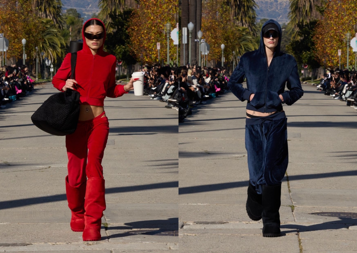 本季以運動裝束為序章,開場第一套 Look 就貼切到不行,就像運動完脫去上衣隨手披在肩上,只穿著一件黑色運動褲,腳踩著巨大運動鞋,手拿與貴婦超市聯名的黑色果汁,邊講電話邊走路,就好像我們日常家裡附近可見的景象,接著短褲、運動內衣、緊身褲和運動衫緊接著來,簡潔明瞭的設計款式,針織服裝致敬美式絲絨運動裝風潮與千奇百怪的名人街拍景象。