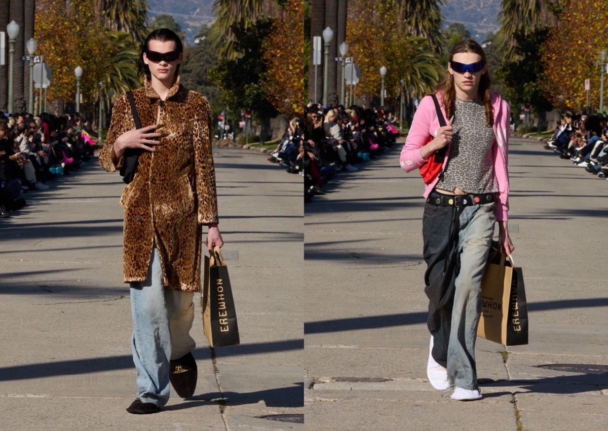 秀上許多單品都印上大大的「Erewhon」字樣,其實 Erewhon 是一家洛杉磯知名的貴婦超市,這次既衝突又驚喜的雙方聯名,不只 T-Shirt、連帽上衣、棒球帽上等基本款單品,連仿牛皮紙袋、尼龍購物袋、圍裙,以及 Erewhon 店內最為人熟知的罐裝果汁都能聯名,是以最代表 Balenciaga 的黑色果汁,是以澳洲青蘋果、檸檬和生薑等口味組成,全系列不只能在 Balenciaga 店面入手,也將期間限定在洛杉磯 10 家 Erewhon 超市販售,超吸睛!