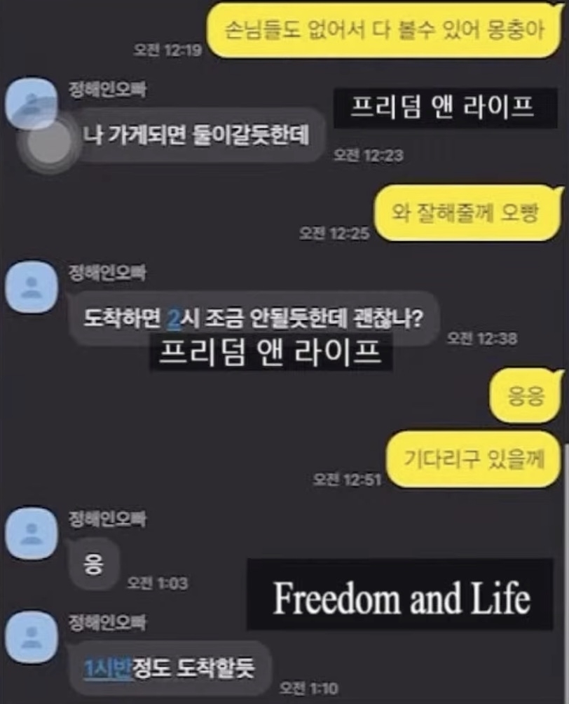 對話紀錄是在2023年9月1日凌晨12:19 發生,內容中可以看見金南熙和對方說「因為沒有多少客人,所以(小姐)都能看到的啦!傻瓜」,接著名稱為丁海寅哥哥的男方回覆:「如過要去的話應該是2位」,得知消息後的金南熙立即說:「哇,會好好招待你的~」最後男方說明大概凌晨1點30半左右或2點會到,金南熙也回應會等他到店裡。爆料文中也有Good Place的相關人士出來表示,丁海寅是為了躲避人們的視線,才選擇在凌晨1點到店裡,或可能是確保能看到更多小姐。