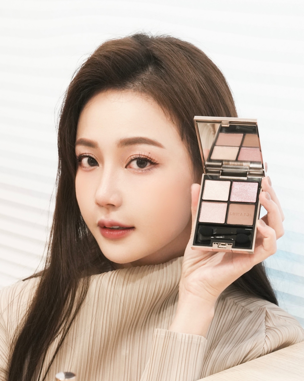 妝容完成還不夠,使用含有4色粉體的LUNASOL星燦光漾亮顏餅才是最完美的ending,一抹上透明感與明亮感馬上顯現出來,顏色超襯膚,與肌膚也融合得恰到好處,暗淡的氣色馬上一掃而空。附贈的刷頭觸感柔順,可以均勻的沾取頰彩,掃在臉上也不會感覺到任何不適感,大面積且輕柔的上妝快速又自然。