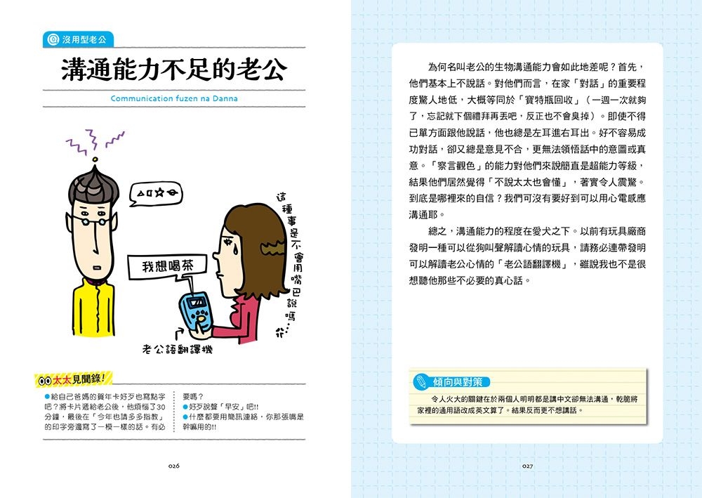 各位妻子們快來找找你的老公是哪種!書中也有爆笑中肯的漫畫的插圖描述各個老公們的特質,搭配作者的解說與妻子們遇到這類老公的內心想法,馬上能引起人妻們的共鳴與安慰。不只介紹,作者還會在每頁最後給予妻子如何應對的建議及提醒,讓妻子們可以嘗試教化看看老公XD