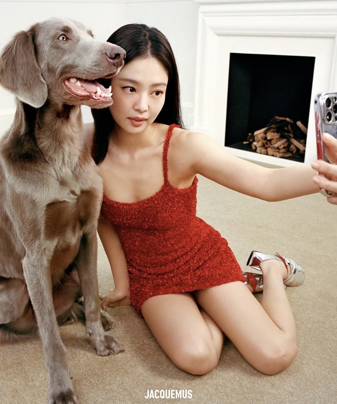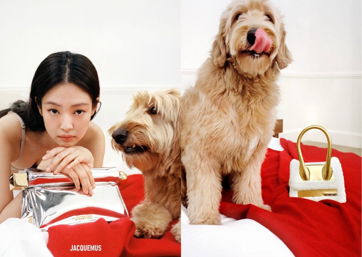 Jacqument 這次邀請 Jennie 共同演繹「GUIRLANDE」假期系列形象照,穿著閃亮紅色毛呢洋裝、杏色連身裙的 Jennie 與狗狗們大玩自拍、或是慵懶側躺在床上被狗狗們包圍,和大狗共同穿鞋的逗趣畫面,其中毛呢細節的包袋、銀色鏡面卷軸手拿包等 Jacquemus 假期系列新品,也出現在這次系列中。