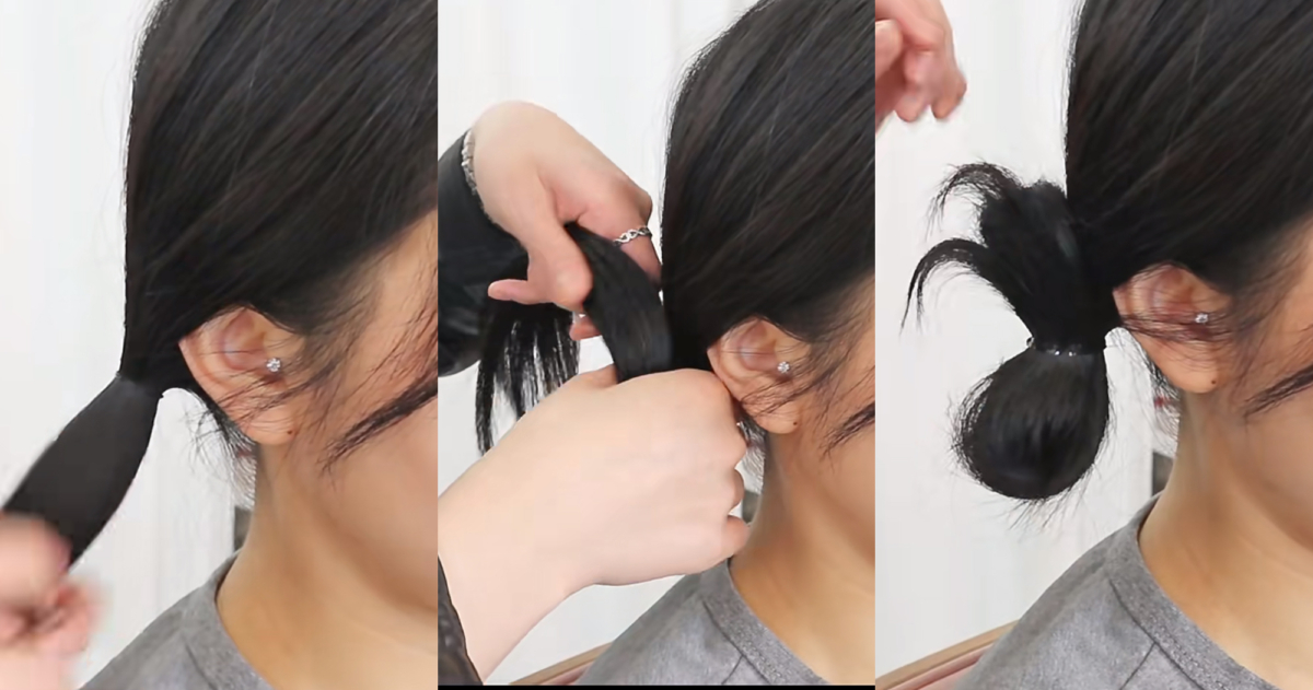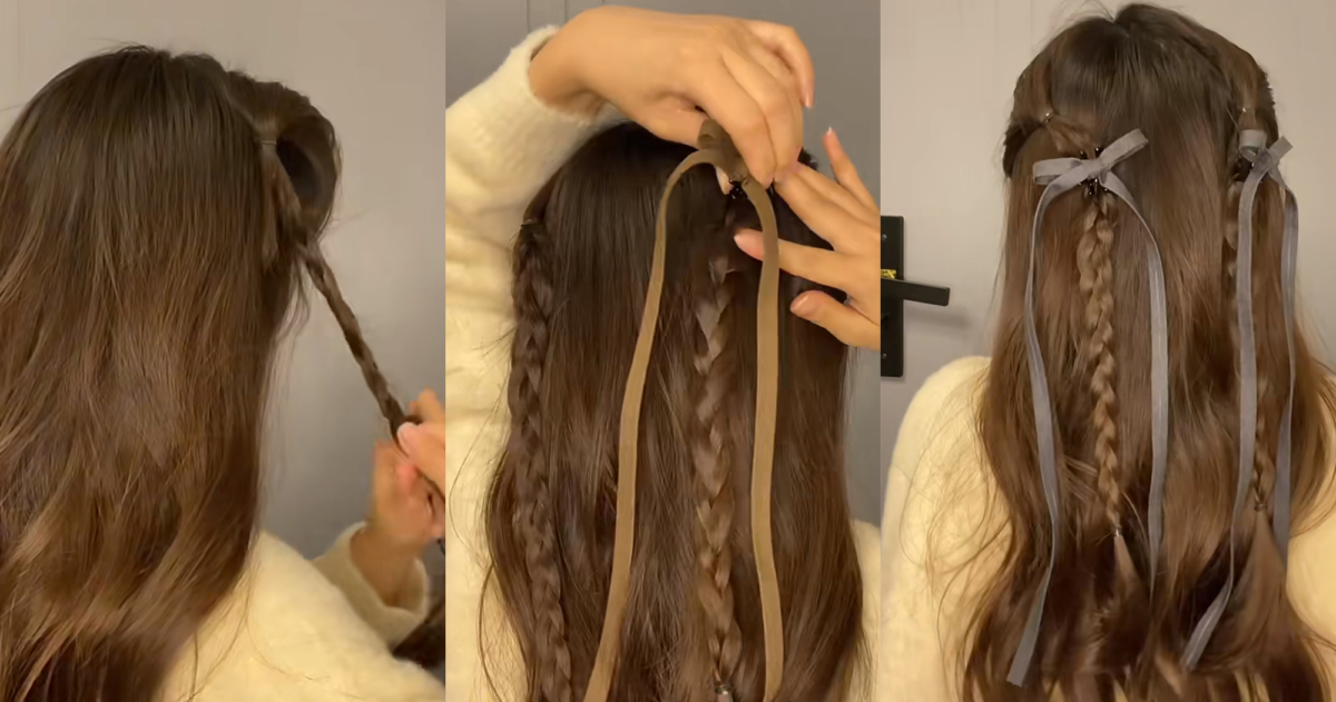 從左右兩側頭頂的位置各抓出一搓頭髮,用橡皮筋鬆鬆的扎起來,主要能讓髮型看起來更加慵懶、不刻意,接著再將下方頭髮以三股編的方式出編出一個緊緊的麻花辮,完成後可以將上方的橡皮筋拉鬆(往下拉),拉到後續夾上髮夾橡皮筋能夠隱藏的位置就可以囉!