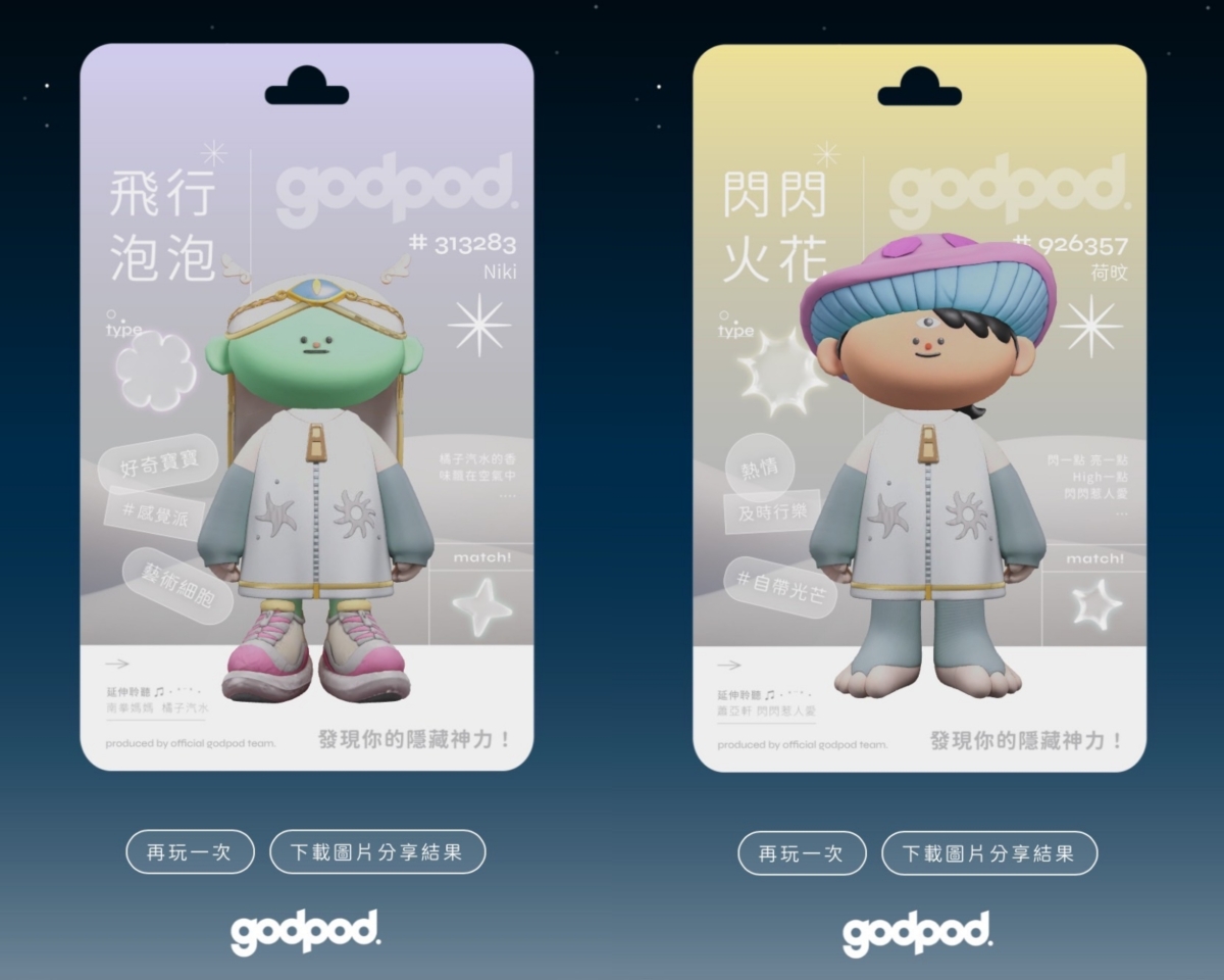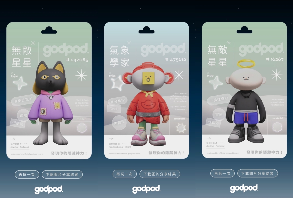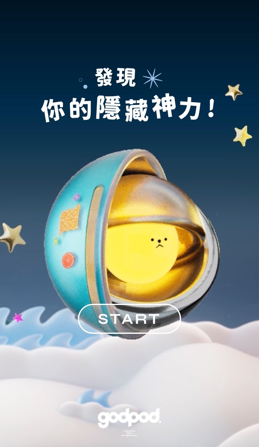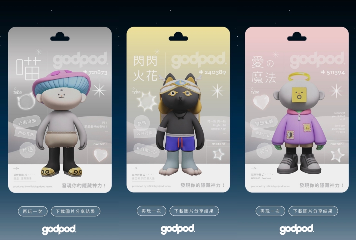 「發現你的隱藏神力」是由一間以3D 設計為導向的動畫工作室「Muzixiii Studio 目子拾參」,爲台北插畫藝術節所企劃「 godpod」項目中的心理測驗,療癒的超Q動畫插圖,搭配舒服的輕音樂,簡單回答4題,就能測出自己是什麼形象的「小神明」!