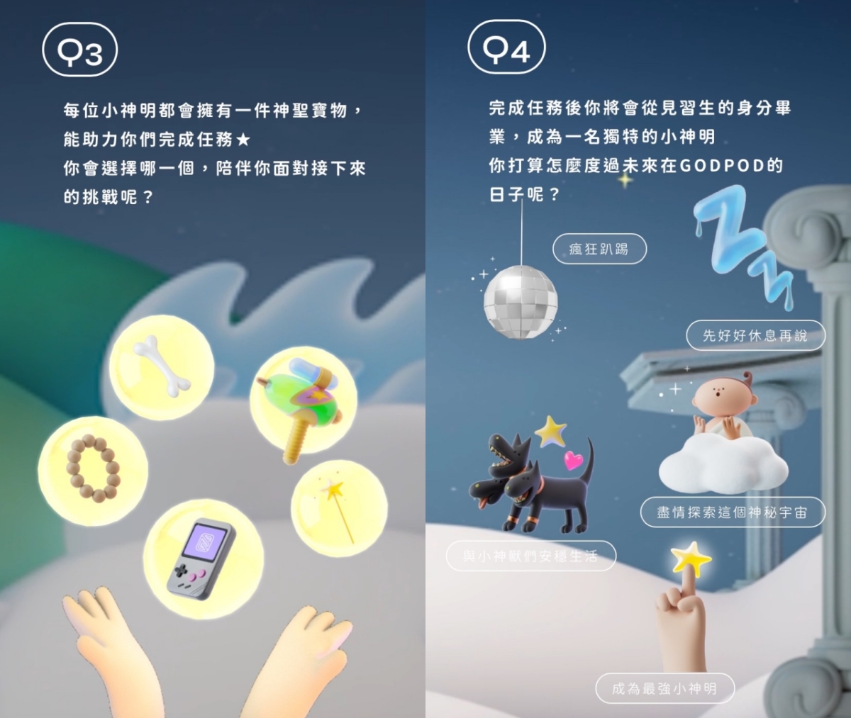 在找尋的過程中,我們會要選擇自己想要的導師、挑戰的任務、專屬的聖物,不一定要靠直覺,可以仔細思考再決定也沒問題,畢竟訓練是要謹慎的~經過3題任務後,只要回答出畢業後想做什麼,就能立即成為獨特的小神明!