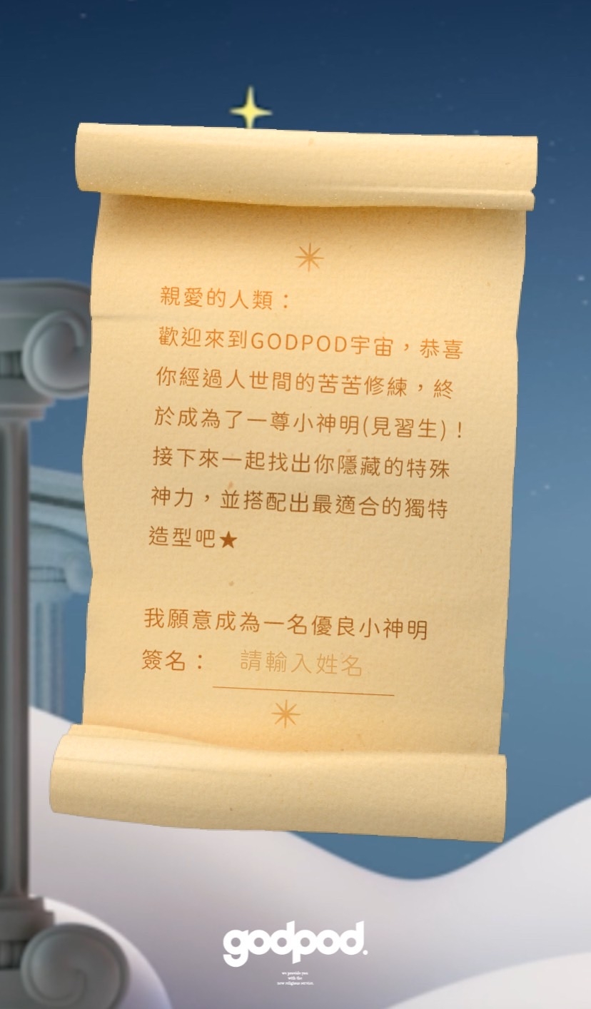 「發現你的隱藏神力」心理測驗要劇情帶入喔!故事設定在我們經過人間的各種修煉後,好不容易正式擁有成為的機會,但在邁向神明之路前,我們還需要度過一段神明見習生的訓練選擇!立下誓約後就可以找尋自己的神力啦♡