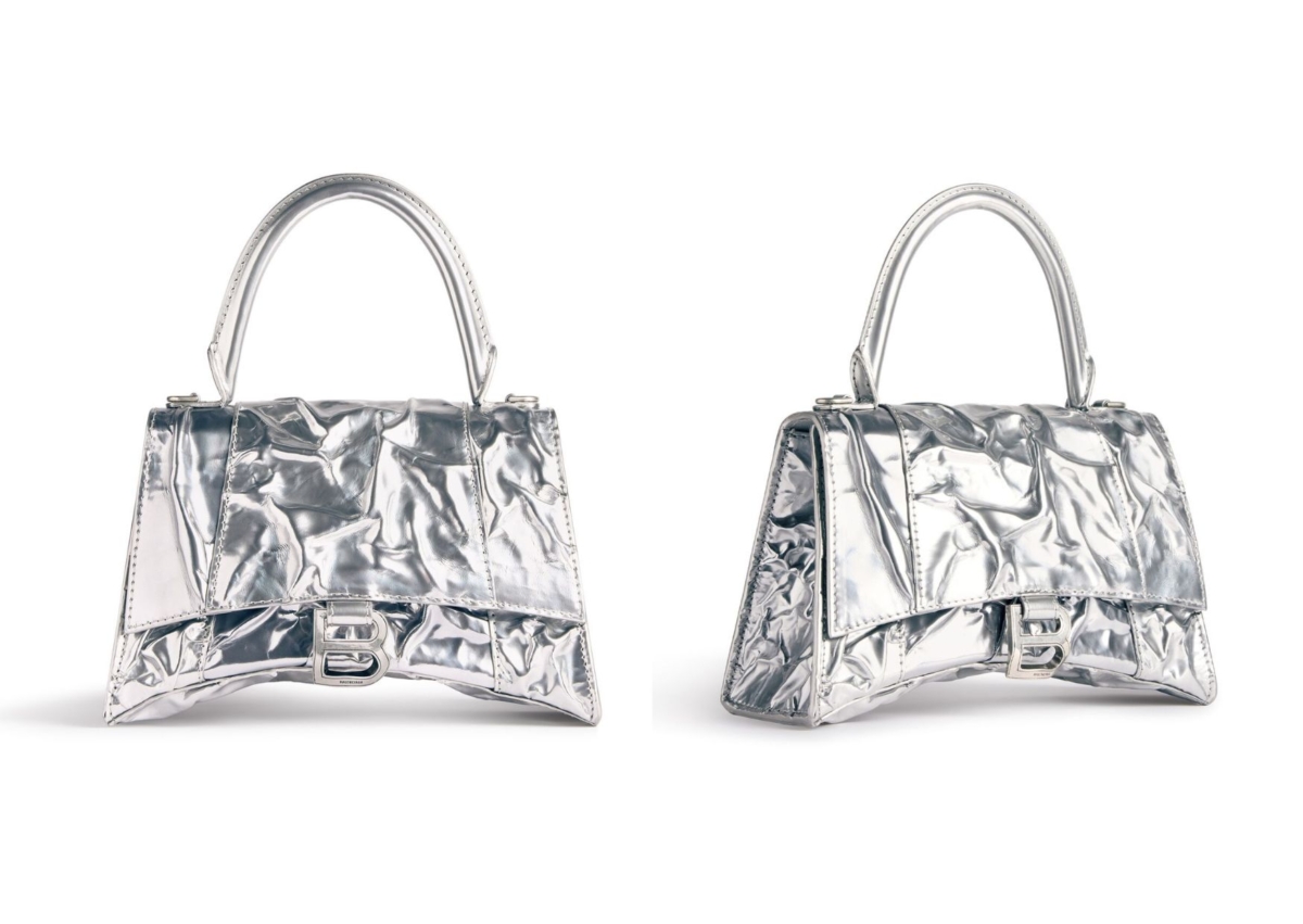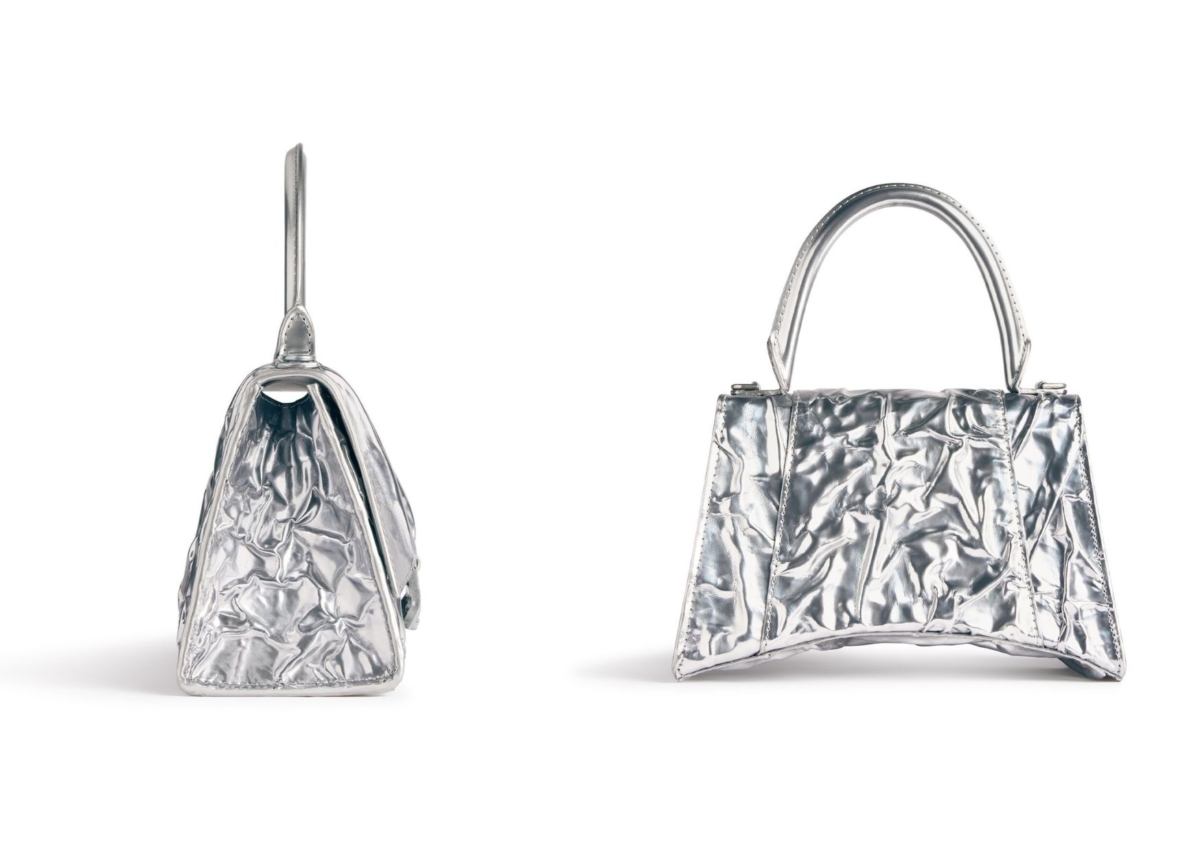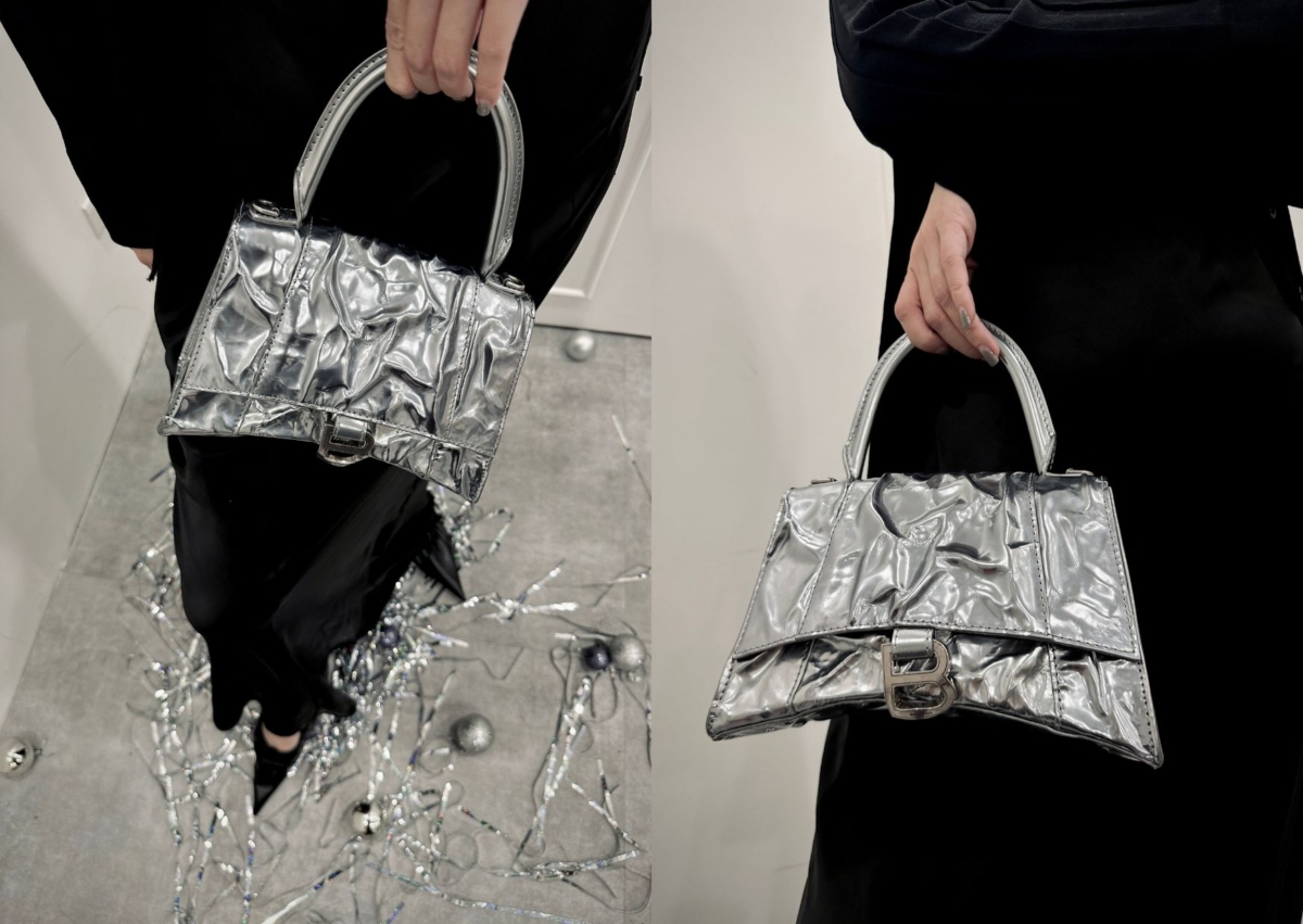 這顆 Balenciaga 銀色碎羊皮沙漏小手提包是其中派對感最強烈的包款!以經典款沙漏外型延伸,採 100% 碎羊皮製作,看似紙張的皺摺感,其實是以品牌經典的仿舊概念去設計,表面的刮傷、脫皮和瑕疵也都是刻意製造的,不得不誇讚 Demna 的創意思考和反操作,反諷大眾消費者為了維護手中的精品包,而百般呵護、一點刮傷就大驚小怪的扭曲心態。