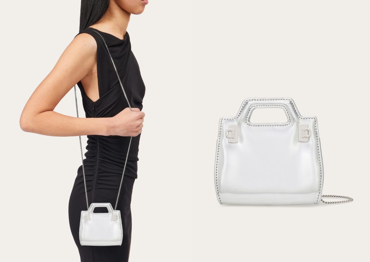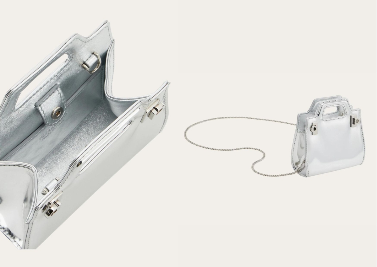 FERRAGAMO全新2023 銀色禮讚HOLIDAY系列,將一系列秋冬主打包、鞋款全都換上惹人注目的銀色新裝,雖然說近期大包當道,但小廢包、晚宴包還是緊追在後,超迷你 Wanda 鍊條包換上搶眼銀色調,猶如珠寶般小巧精緻又細膩,玩弄幾何形狀和體積,表面兩側飾有雙 Gancini 扣飾,容量大小放得下口紅等小物品,參加派對或當成婚禮晚宴小包都很適合!
